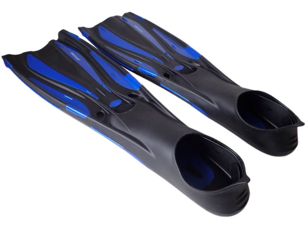 Ploutve mají gumové pružné výztuhy pro lepší proudění vody. V barvě tmavě modré.