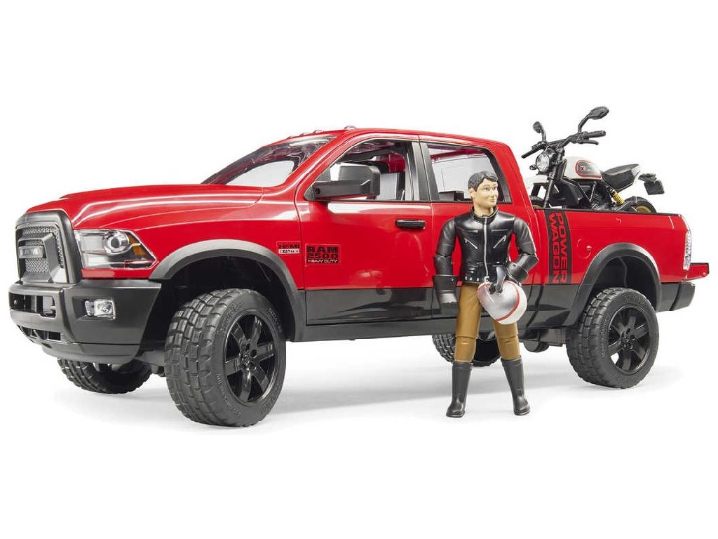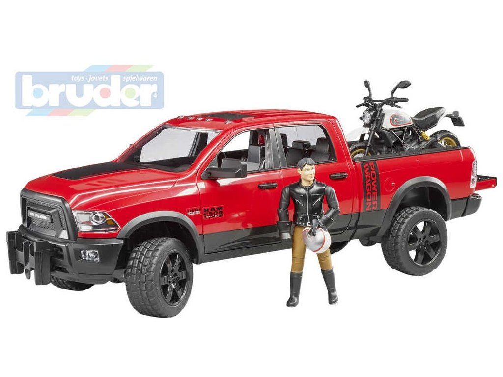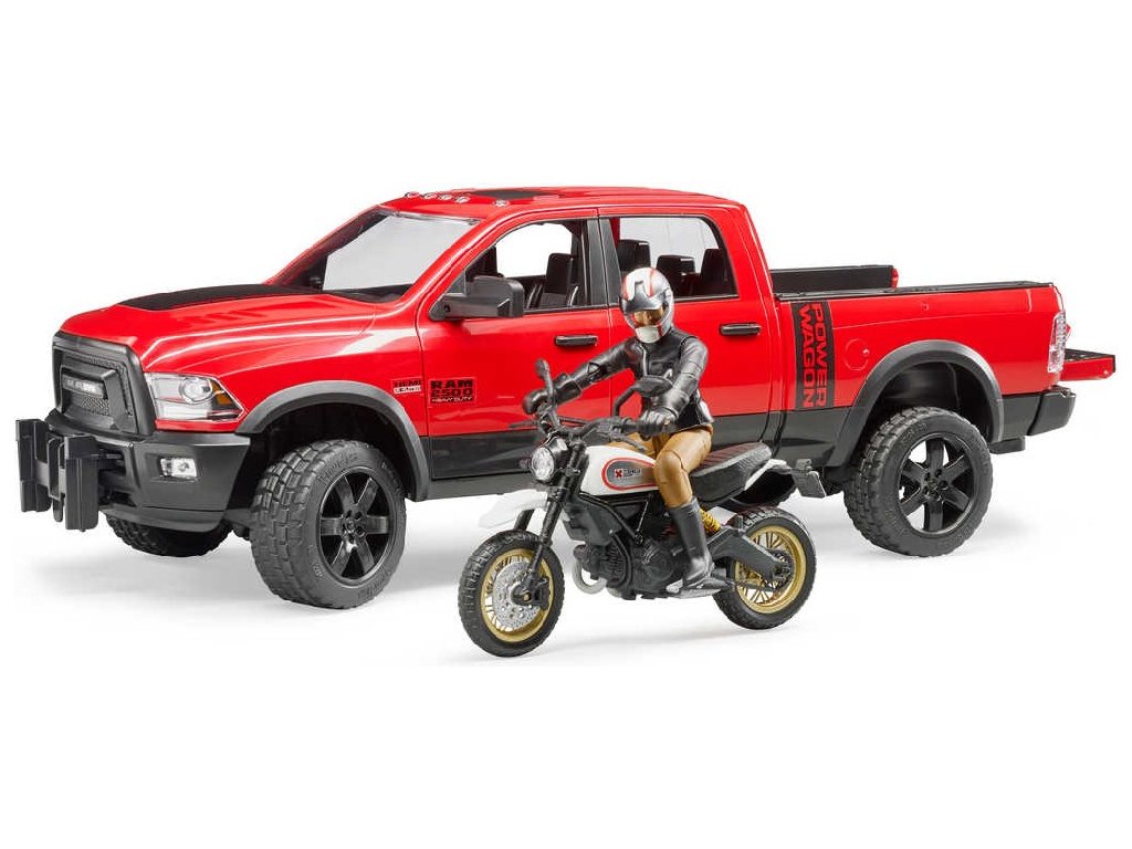 BRUDER 02502 - Tento set terénního automobilu RAM s terénním motocyklem Scrambler Ducati Desert s figurkou jezdce, je jedním z dalších detailně zpracovaných modelů Bruder.