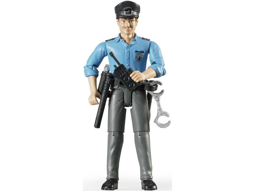 policista má čepici, pistoli, opasek, obušek, baterku, pouta a vysílačku -