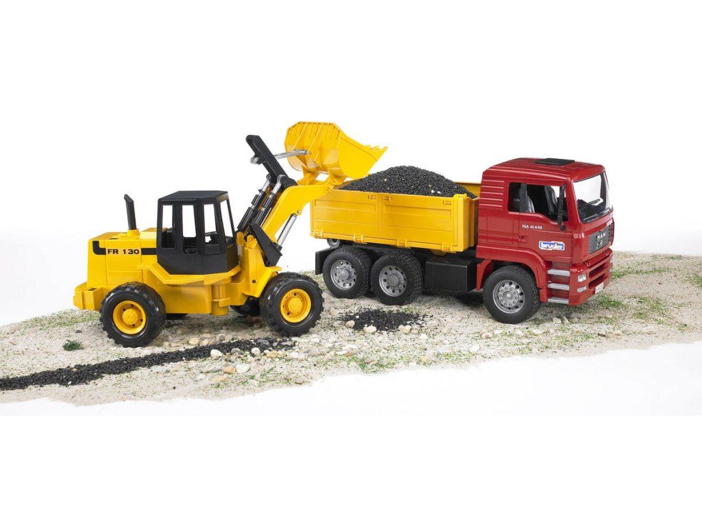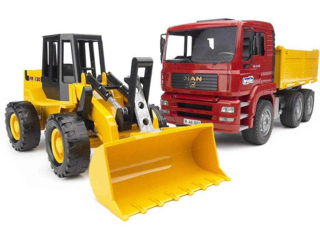 Sada obsahující model slavného nákladního vozu Man TGA a čelní nakladač FR130 potěší každého kluka. Tyto luxusní modely jsou vyvedeny v měřítku 1:16 a vyrobeny jsou z kvalitního a odolného plastu. Díky jedinečným funkcím jsou zárukou perfektní zábavy. Nákladní vůz nabízí sklopná zrcátka a korbu, jeho kabina je zasklená odolným polykarbonátem. Nakladač pak disponuje velkou čelní radlicí a naklápěcí přední nápravou pro komfortní jízdu v jakémkoli terénu.