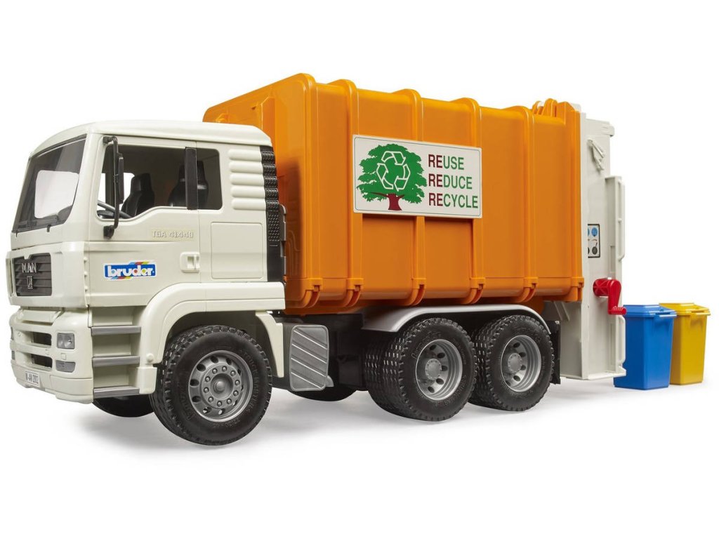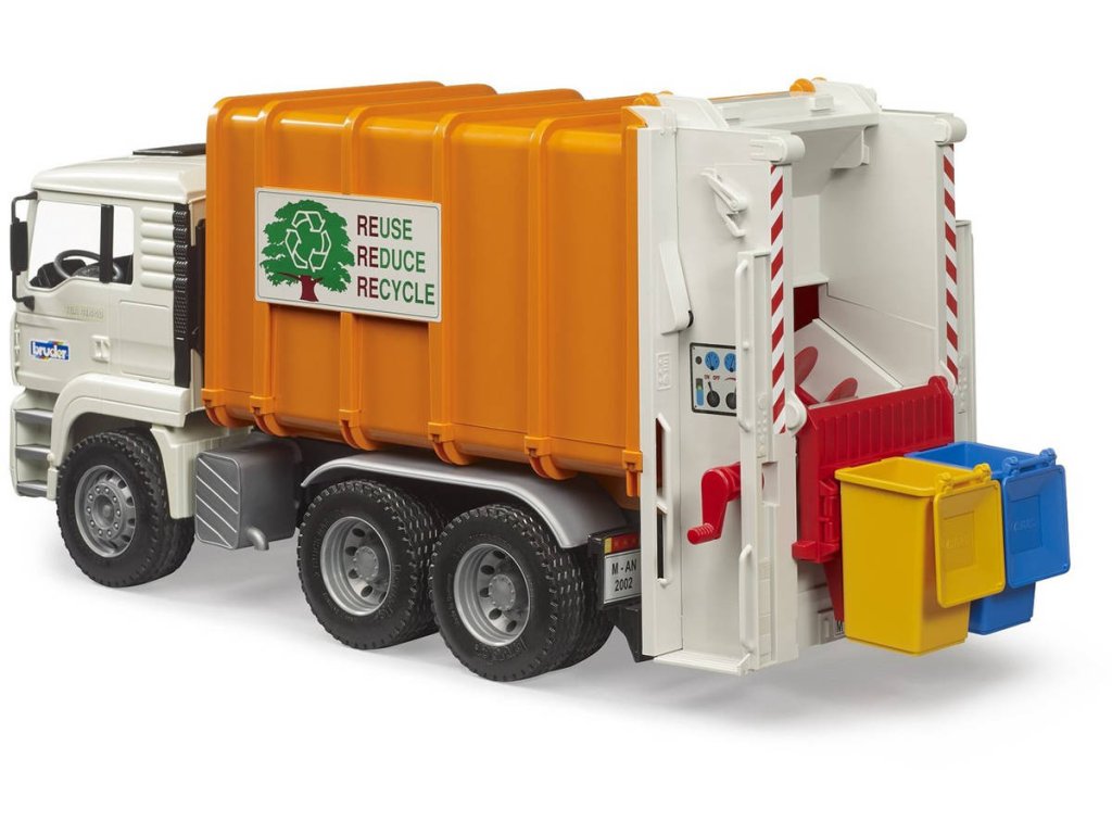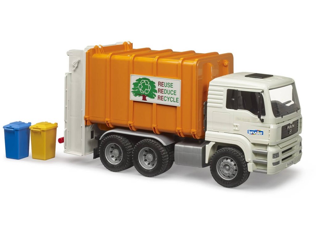 BRUDER 02772 Auto popelářské MAN TGA popeláři bílo-oranžové. Detailní model, kvalitní a odolný plast, funkční části, vyrobeno v Německu. Součástí 2 popelnice.