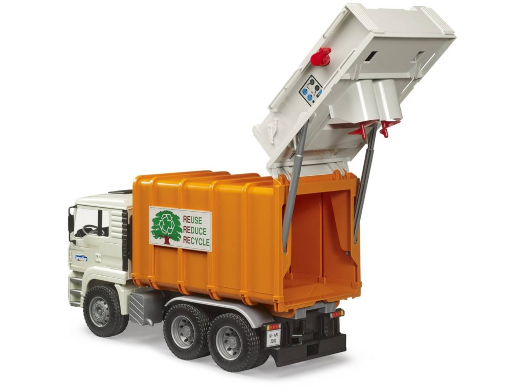BRUDER 02772 Auto MAN TGA popeláři bílo-oranžové funkční model 1:16 plast