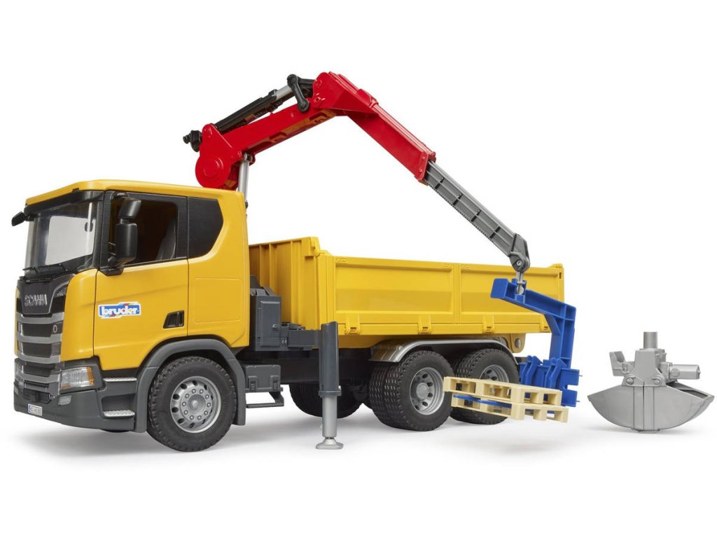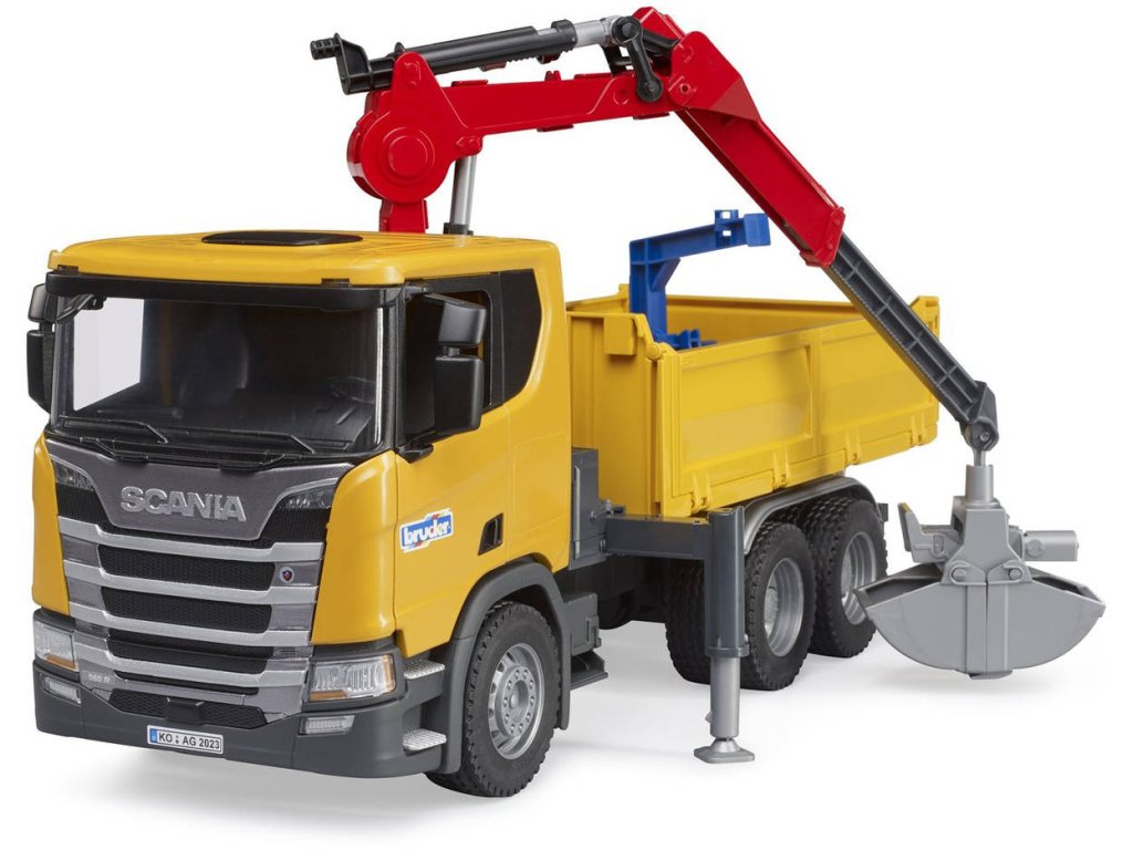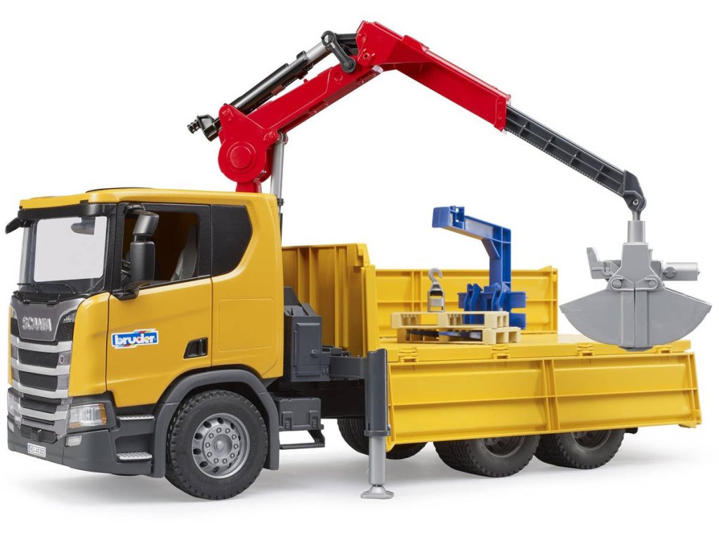 Komfortní a robustní BRUDER představuje ve své řadě řadu Scania Super R. Řada R se vyznačuje jedinečnou kombinací pohodlí a odolnosti. Proto se ideálně hodí do všech situací, které nastanou. Přesně tyto různé situace mohou děti realisticky zažít s novými modely od BRUDER. Nová kabina řidiče ukazuje typický dynamický design Scanie. K dispozici jsou sklopná vnější zrcátka a otevírací dveře. Karoserie vozidla se skládá z výklopné ložné plochy se třemi sklopnými bočními stěnami. Za kabinou řidiče se nachází o 360° otočný, výklopný a teleskopický nakládací jeřáb, který lze volně přemísťovat rukou a držet v libovolné poloze aretací. Kromě toho jsou na straně nakládacího jeřábu připevněny výsuvné a sklopné podpěry, které vozidlu poskytují větší stabilitu při nakládání. Vzhledem k tomu, že součástí balení jsou i paletové vidle se dvěma paletami a drapák na lopatu, hra může začít okamžitě.
