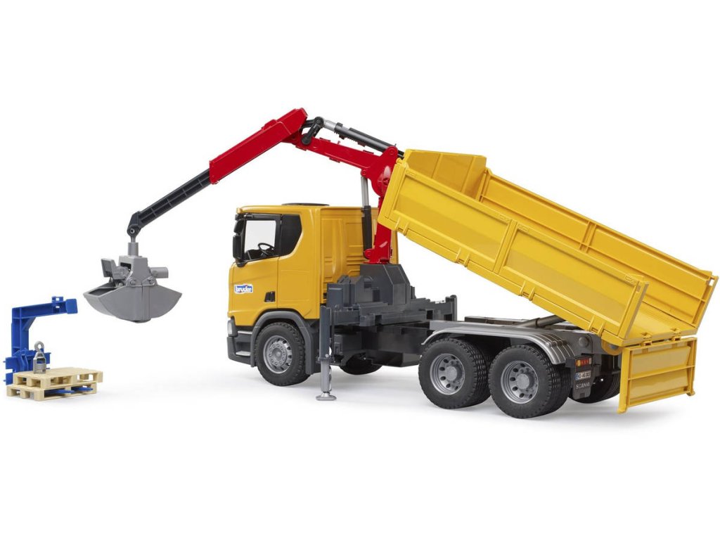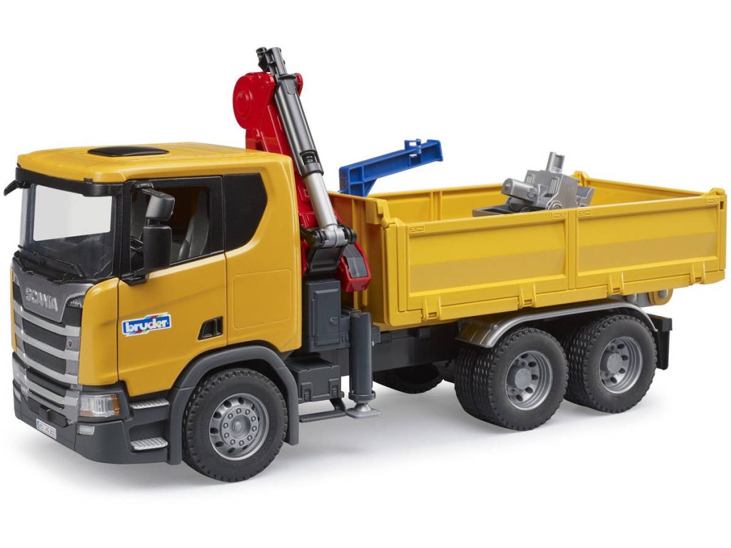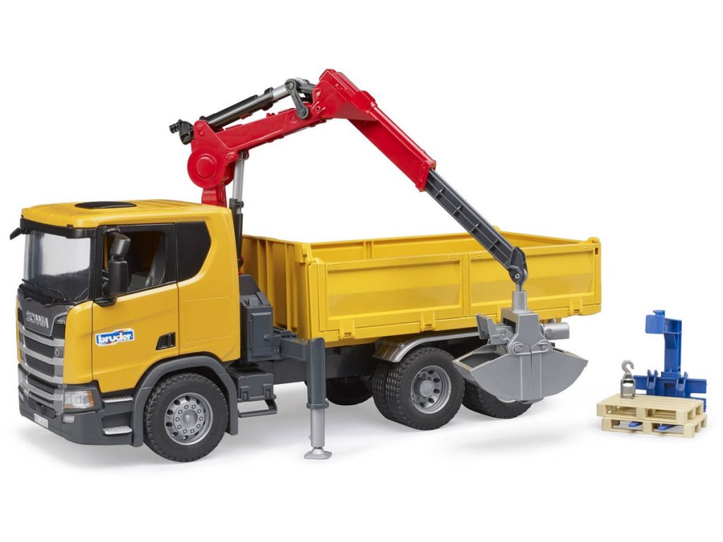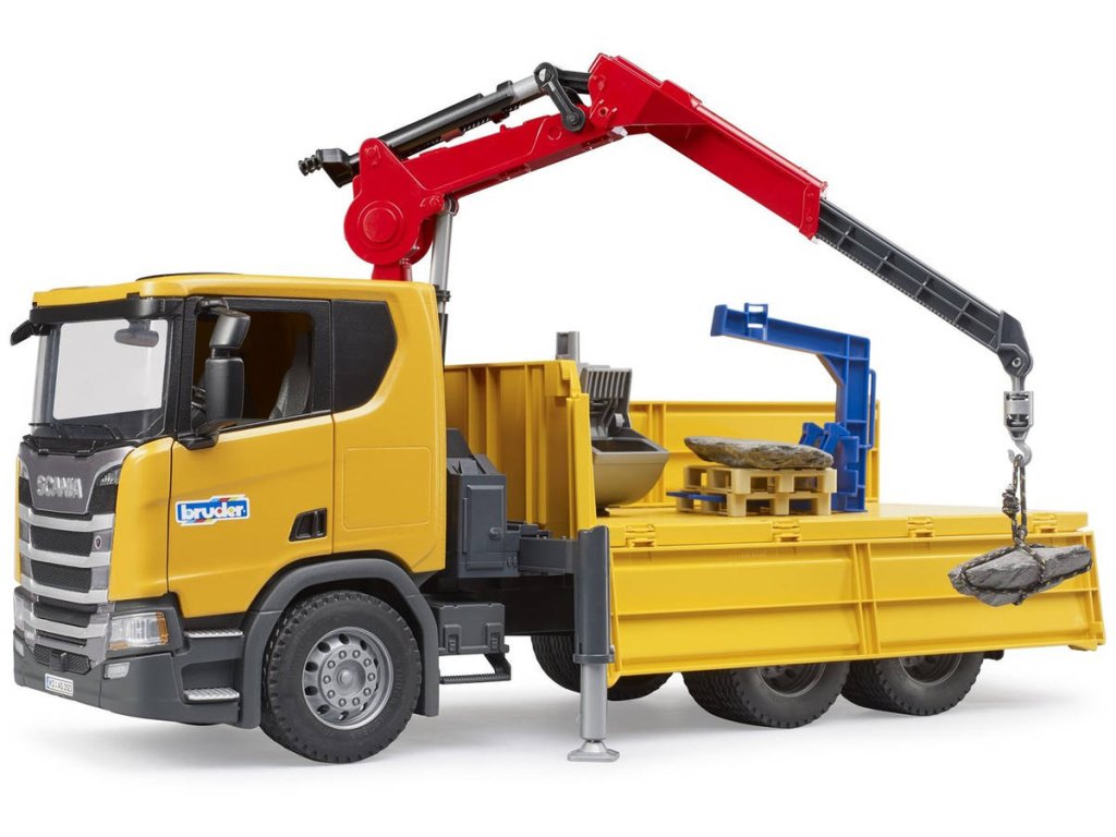 BRUDER 03551 Auto nákladní Scania Super 560R valník s mechanickým ramenem. Detailní model, kvalitní a odolný plast, funkční části, vyrobeno v Německu.