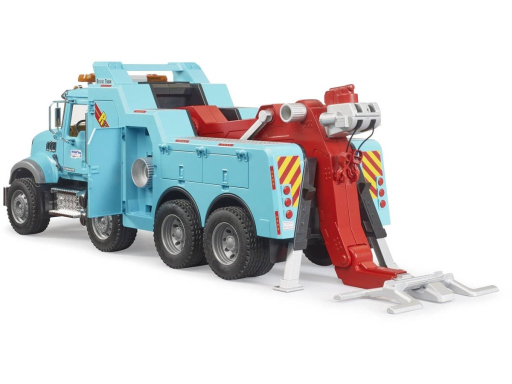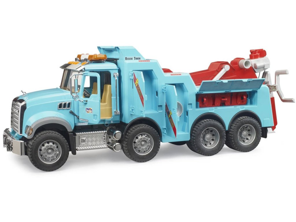 A vynikající výkon a technologie těchto vozidel jsou působivé. Ve společnosti BRUDER mohou nyní děti objevit a znovu vytvořit tyto fascinující vlastnosti na novém vyprošťovacím a odtahovém voze MACK Granite. Zvedák kol lze sklopit a pojme přední kola taženého vozidla. Za jednou z mnoha otevíracích klapek se nachází výškové nastavení hlavního ramene, které slouží ke zvednutí hlavního ramene a vozidla. Na konci teleskopického hlavního ramene je umístěn lanový naviják. Dodávaný adaptér lze připevnit na nárazník MB Arocs, MAN TGS, MACK nebo Scania, které mají být vyprošťovány, a vozidlo, které se stalo účastníkem nehody, lze vyprostit a pomocí lanového navijáku odtáhnout ke zvedáku kol.