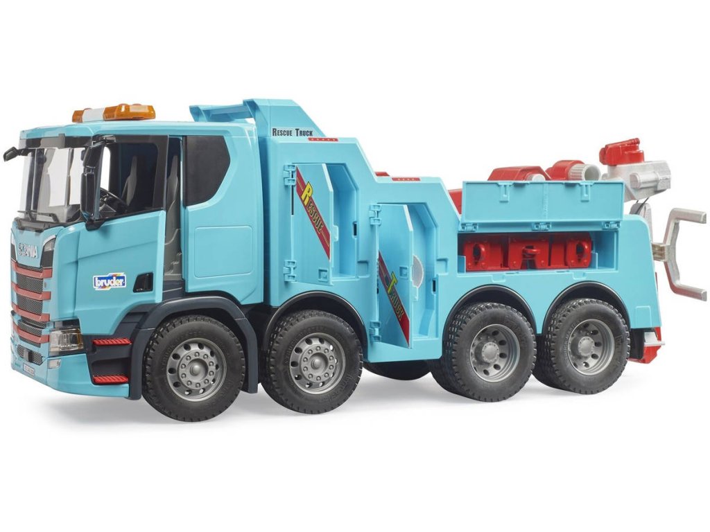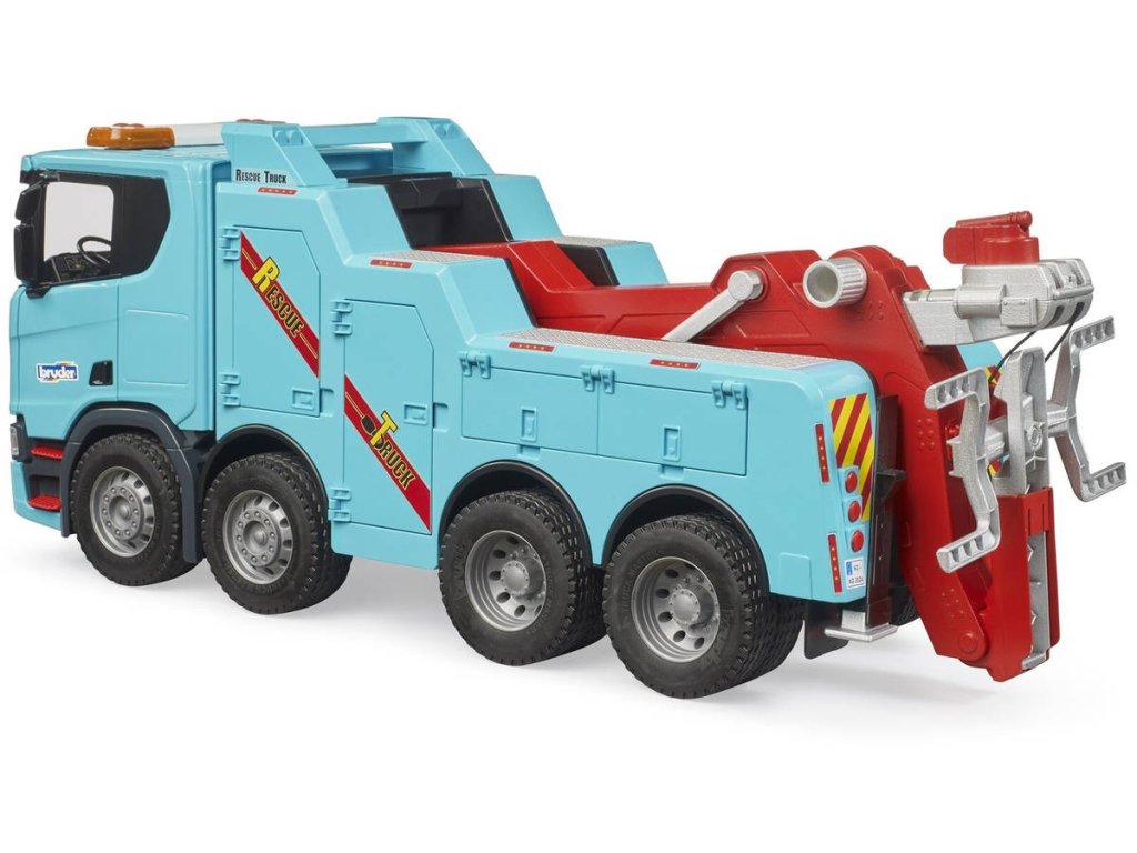 Ve společnosti BRUDER mohou nyní děti objevovat a znovu vytvářet tyto fascinující funkce na novém vyprošťovacím a odtahovém voze Scania Super 560R. Zvedák kol lze sklopit a pojme přední kola taženého vozidla. Za jednou z mnoha otevíracích klapek je umístěno výškové nastavení hlavního ramene, kterým lze hlavní rameno včetně vozidla zvednout. Na konci teleskopického hlavního ramene je umístěn lanový naviják.