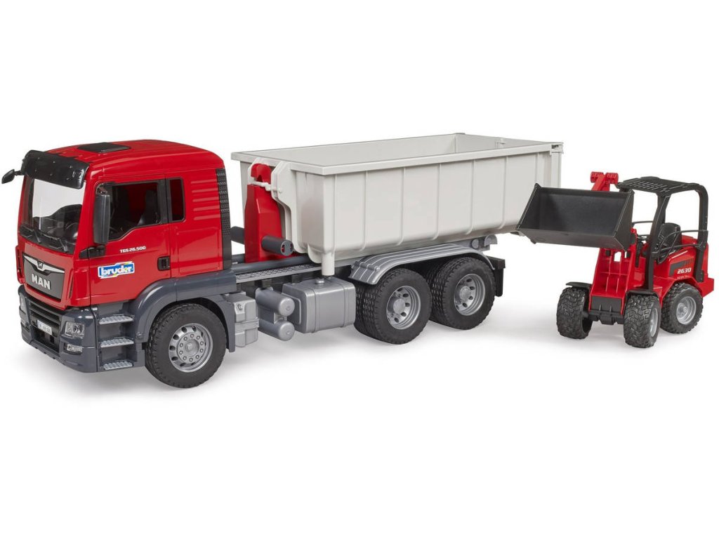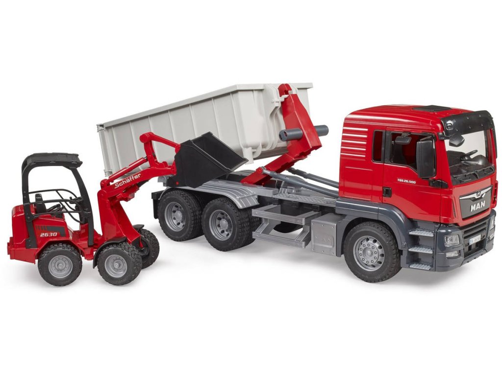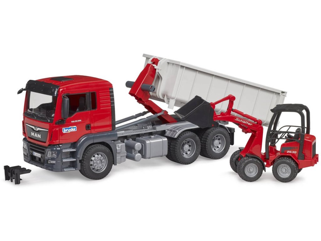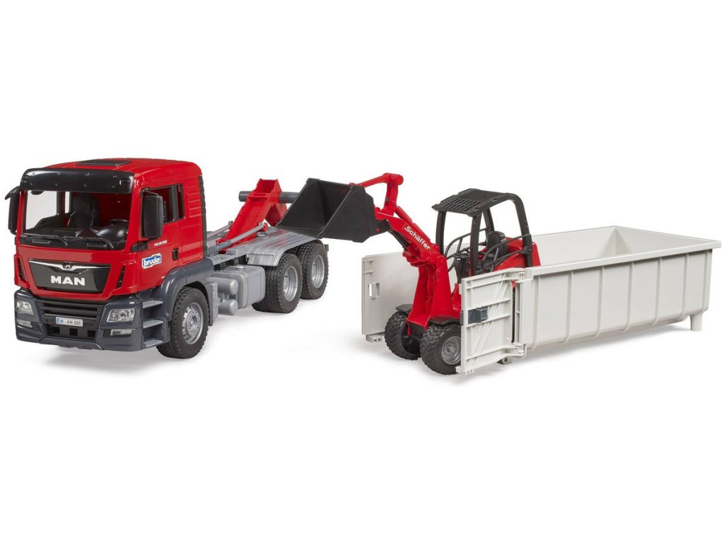 BRUDER 03767 Auto MAN TGS LKW s kontejnerem + nakladač Schäffer. Detailní model, kvalitní a odolný plast, funkční části, vyrobeno v Německu. Součástí setu jsou 2 vozidla.