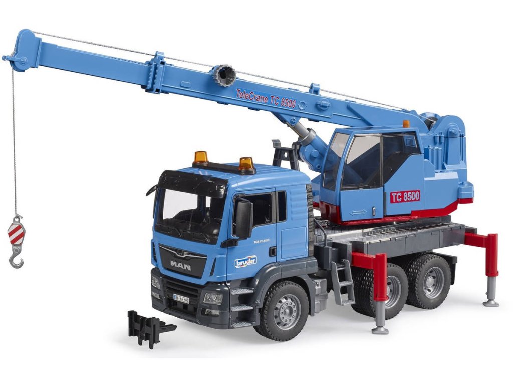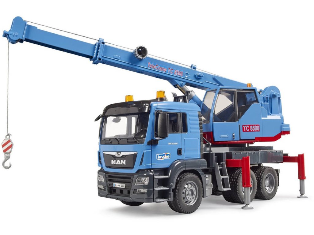 BRUDER 03771 MAN TGS Modrý autojeřáb s teleskopickým ramenem. Detailní model, kvalitní a odolný plast, funkční části, vyrobeno v Německu. Hračka na baterie, se světlem a zvukem.