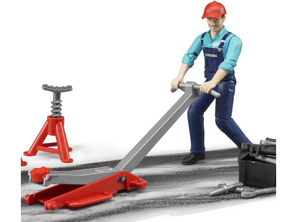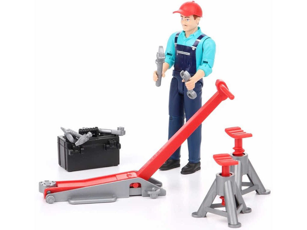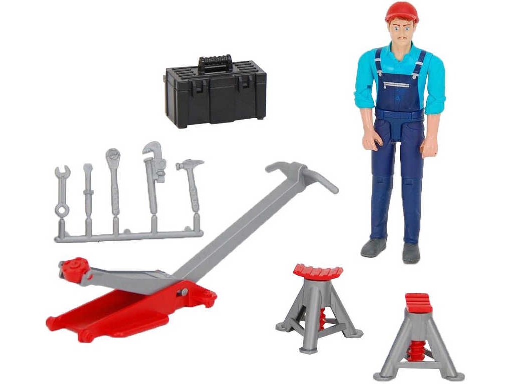 BRUDER 62100 - Plastová figurka mechanik opravář s příslušenstvím je výborným doplňkem ke každému ze strojů Bruder. Kluci mohou mechanikovi pomáhat se seřízením a servisem mohutných strojů. Figurka má ohebné kloubové končetiny a hlavu, kterou je možno ohýbat ve 3 polohách. Ruce mohou držet různé předměty nebo se držet strojů a vozidel.