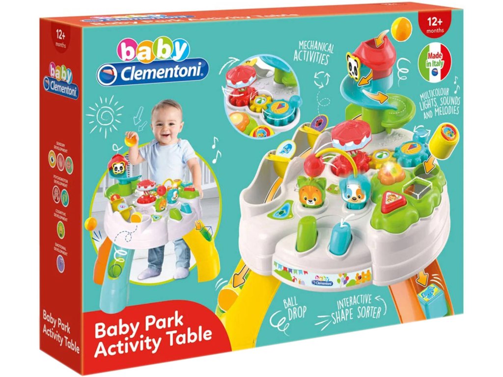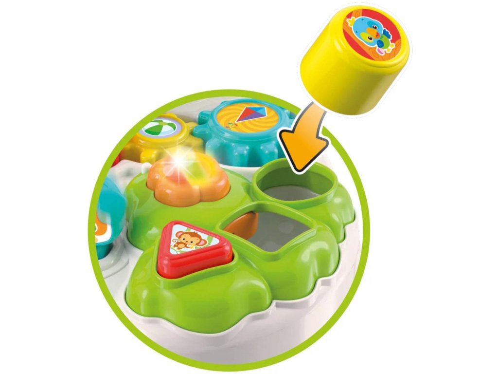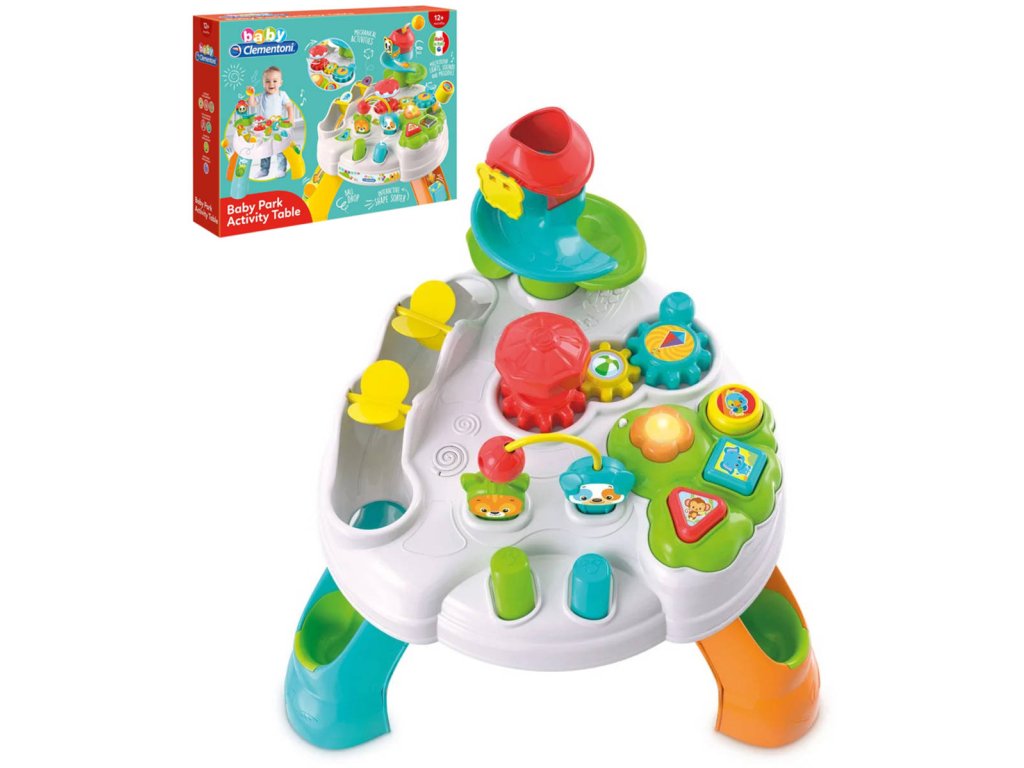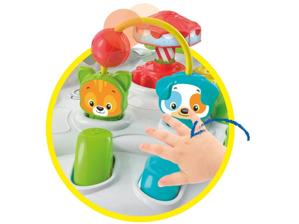 CLEMENTONI Clemmy baby - Veselý hrací stolek s kostkami a zvířátky zabaví Vaše děti po dlouhý čas. Hrací stoleček s mnoha aktivitami, jejichž cílem je stimulovat interakci s dítětem. Vkládací tvary se světly a zvuky, otáčející se ozubená kolečka a tlačítka ovládající pejska a kočku. Součástí stolku je zábavná trasa pro míčky se spoustou úžasných skluzavek a překážek. Míčky končí svou jízdu v noze stolku. Hračka stimuluje manuální dovednosti, vizuální vnímání a rozpoznávání vztahu mezi příčinou a následkem.