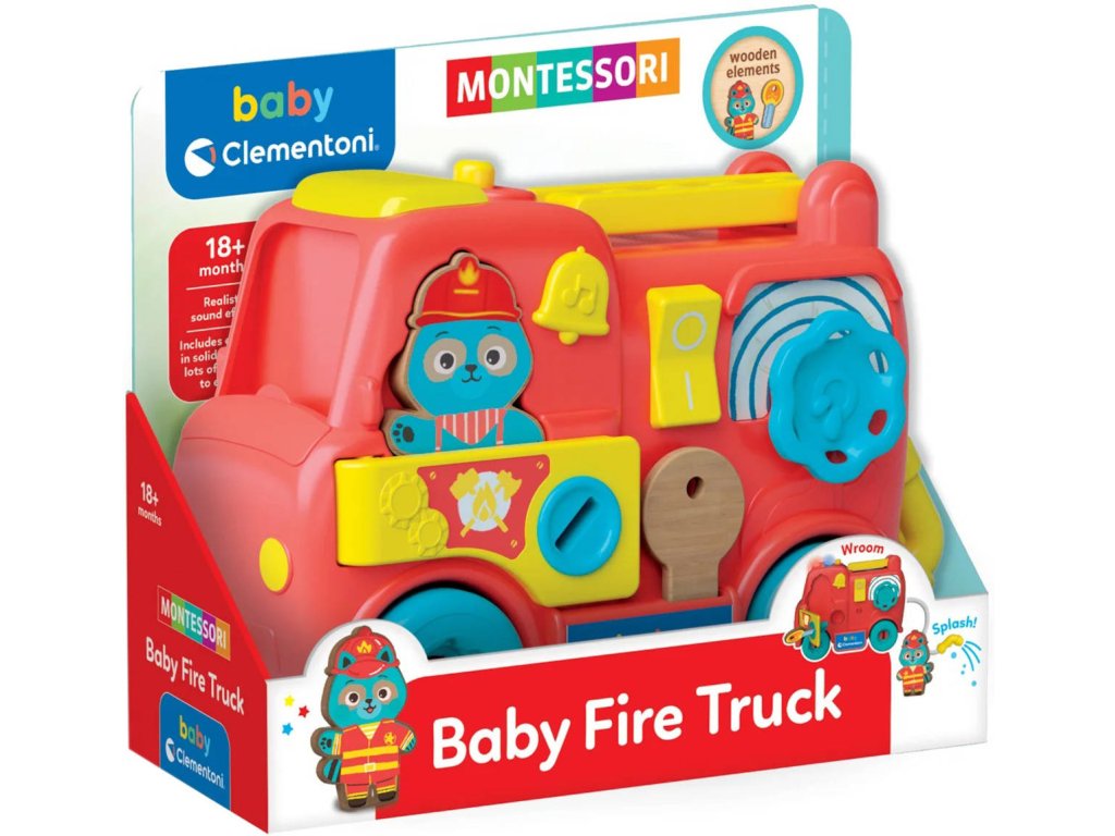 Hasičské auto, které se stane centrem aktivit inspirovaným metodou Montessori. Hrací sada stimuluje manuální dovednosti dětí, přiměje je vykonávat běžné činnosti a provádět každodenní úkony: používání vypínače, vodovodního kohoutku, zvonku a klíče. Hasičské auto se stává rozšiřitelnou hrací sadou s Montessori dětským domečkem Clementoni.