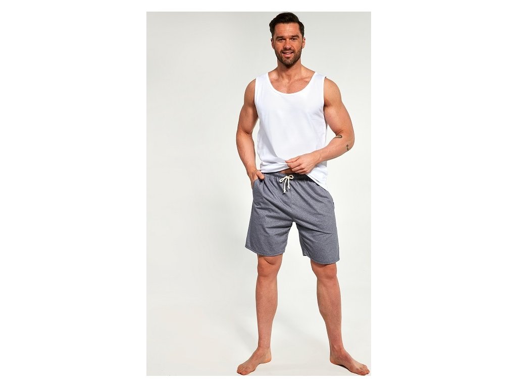 Pánské pyžamo vyrobeno z kvalitní bavlny. Horní díl s kulatým výstřihem, bez rukávu, kalhoty krátké se šňůrkou v pase na utažení. Baleno ve stylové krabičce.