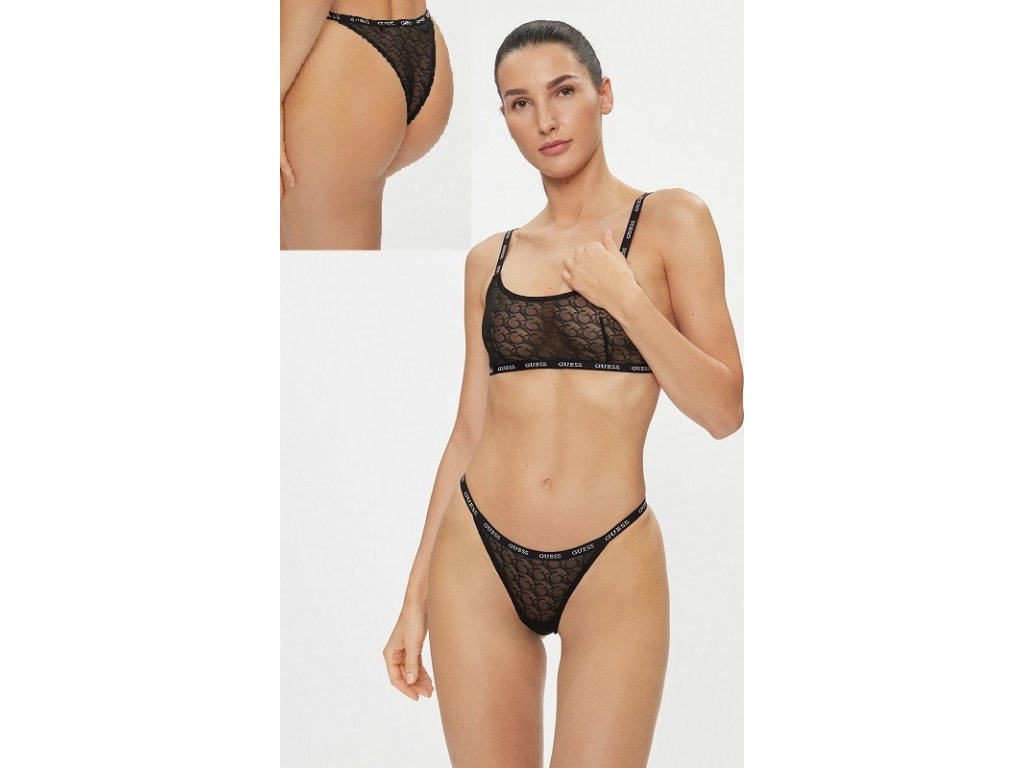 Dámské kalhotky brasilského střihu. Kahhotky jsou celé krajkové a v klínku mají bavlnu. V pase po obvodu je logo Guess. Baleno v transparentním obalu.