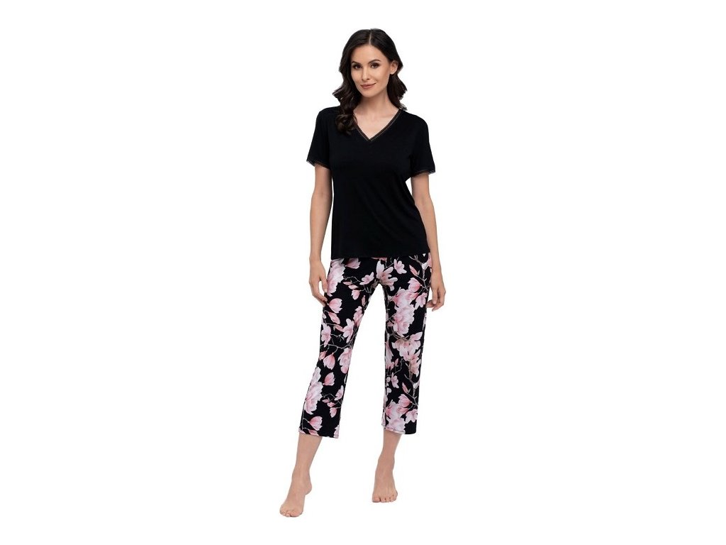 Dámské pyžamo má top s krátkým rukávem a výstřih, který je lemovaný jemnou kraječkou, stejně jako rukávy pyžama. Kalhoty mají vzor květů magnolie. Baleno v dárkové krabičce.