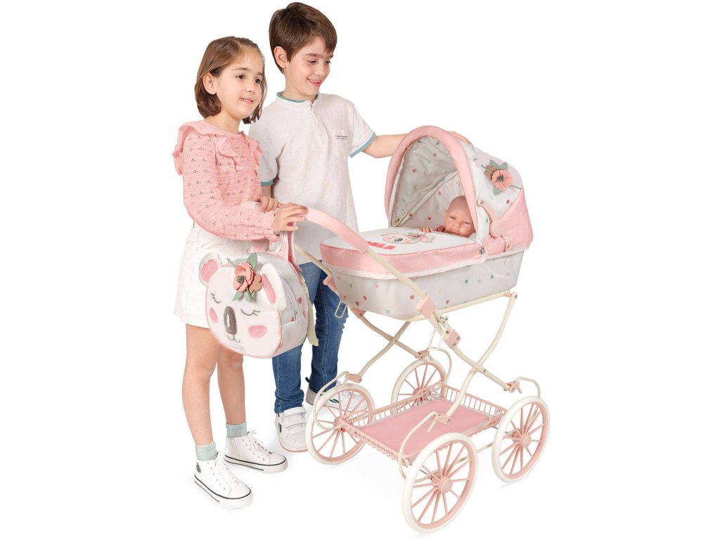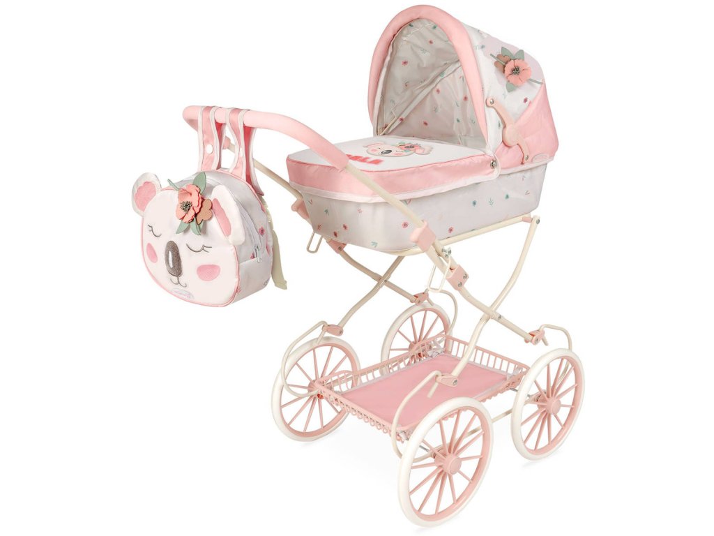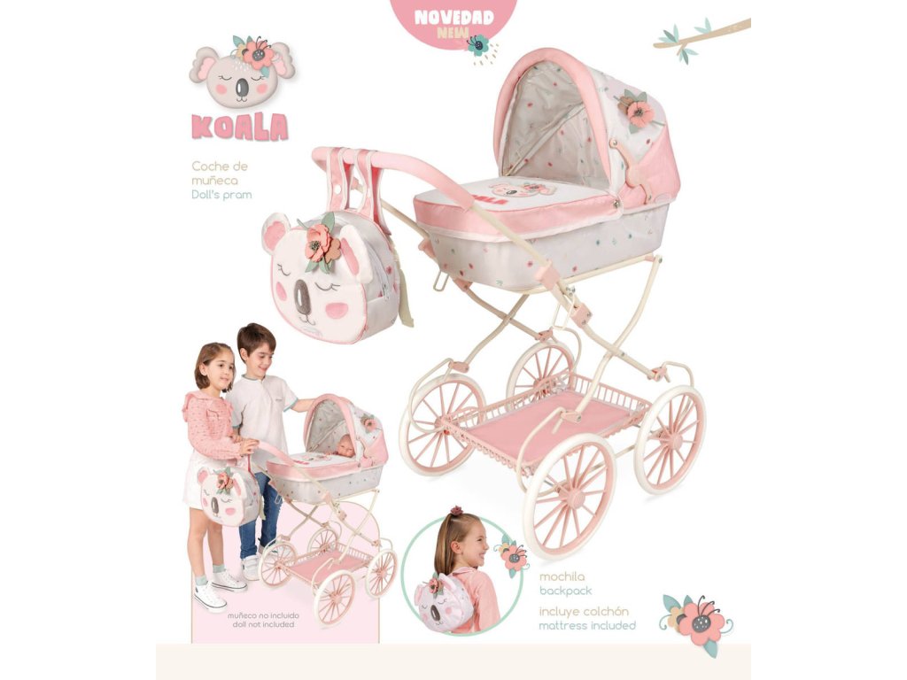 Kočárek je díky vysoké rukojeti spíš vhodný pro větší slečny. Kolekce nabízí nejen kočárky, ale i jiné doplňky pro malé slečny a jejich panenky. Tato dívčí kolekce KOALA je doslova něžnost sama. Spící medvídek s květinou za ouškem je velmi roztomilý. Tento motiv doprovází každý výrobek z kolekce. V provedení se střídá bílá s drobným květinovým potiskem s lososově růžovým jednobarevným materiálem. Nádherný španělský design, precizní zpracování. Skládací model, velmi snadná manipulace během samotné hry.
