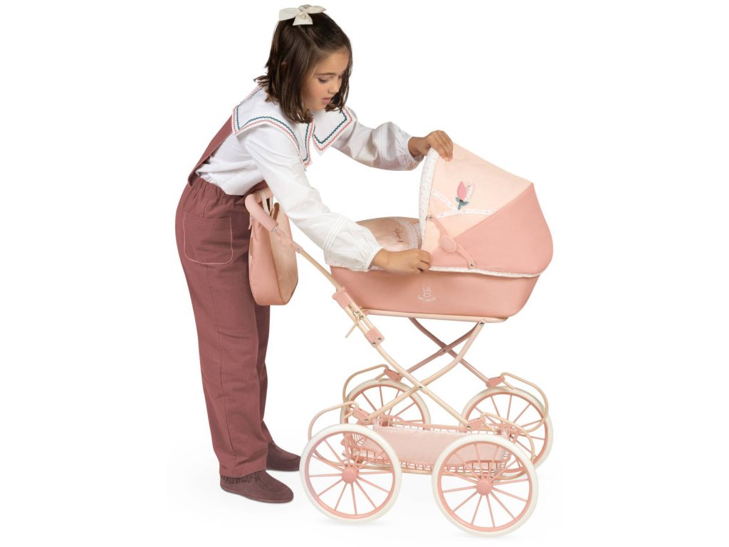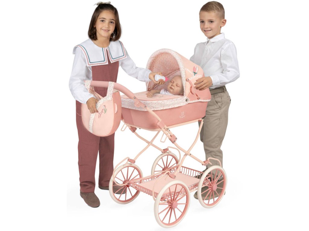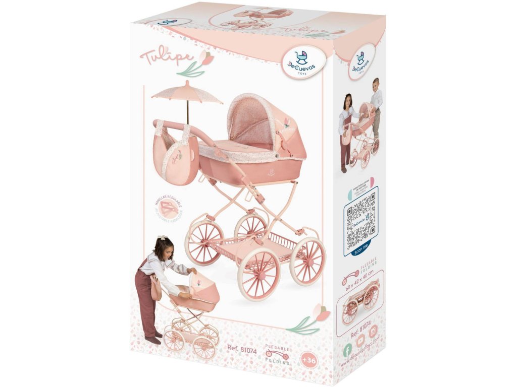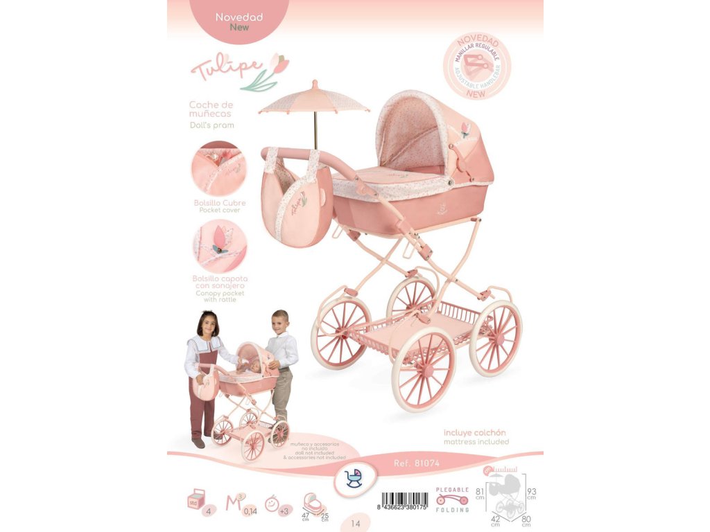 DeCuevas 81074 Skládací kočárek pro panenky s taškou a doplňky Tulipe 2025 - 81 cm ze stejnojmenné kolekce, která je novinkou roku 2025, je díky vysoké rukojeti spíš vhodný pro větší slečny. Tulipe je, jak již sám název napovídá, kolekce plná tulipánů v překrásně sladěných teplých pastelových lososových barvách. Světlejší a tmavší odstíny barev jsou vkusně doplněné drobným květinovým vzorem ve stejných tónech na bílosmetanovém podkladu. Tento motiv ještě navíc u kočárků umocňují svým tematickým tvarem i překrásné, jako tulipán vypadající tašky. Květ tulipánu zdobí i dřevěné výrobky této kolekce. Tato kolekce nabízí výběr výrobků od jídelních sad přes postýlky a kočárky až po dřevěný nábytek pro panenky. Jeho designové zpracování ho řadí mezi kočárky zakoupené i pro sběratelské účely. Nádherný španělský design, precizní zpracování. Skládací model, velmi snadná manipulace během samotné hry. Materiál: kov, plast, textil. Baleno v krabici v barvách kolekce.