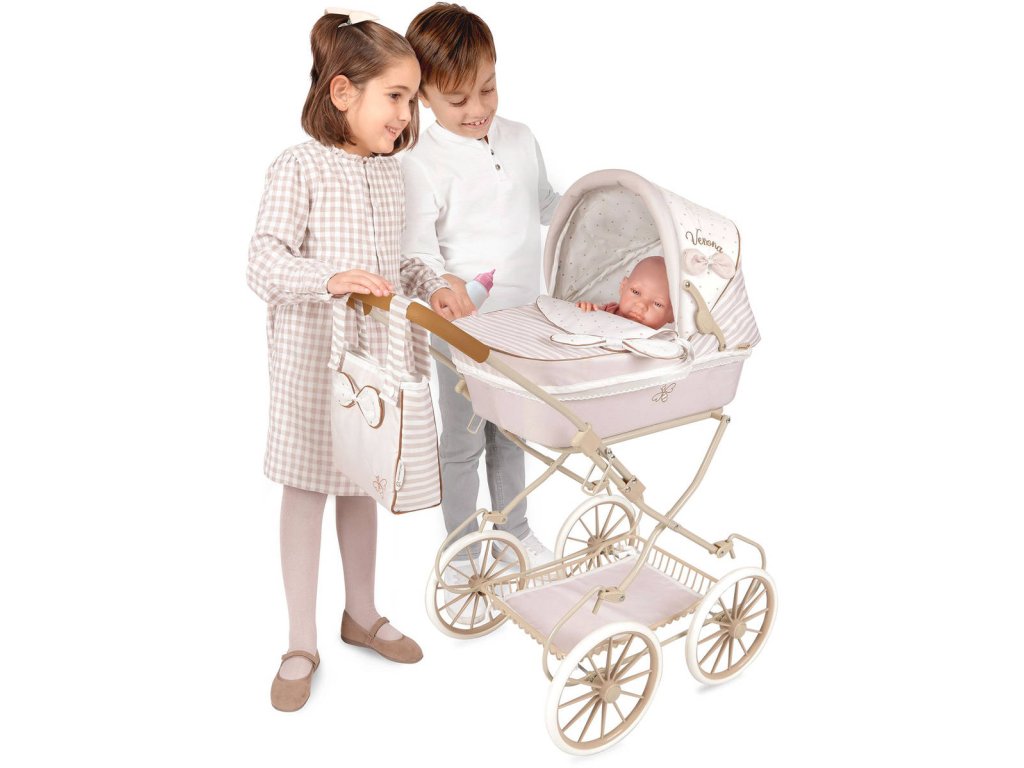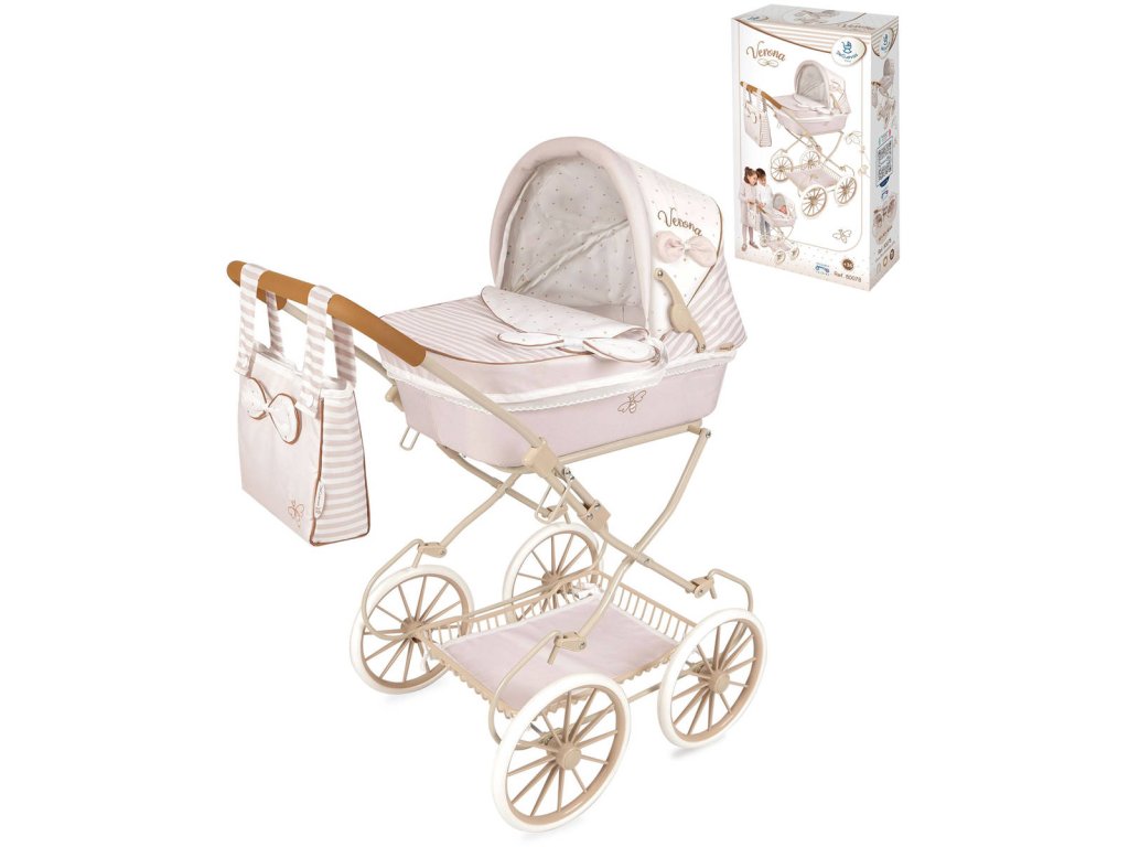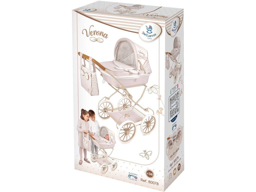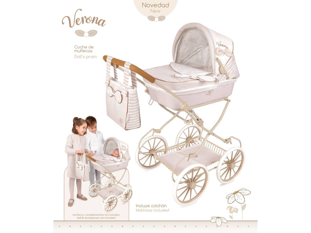 Kočárek je díky vysoké rukojeti spíš vhodný pro větší slečny. Kolekce nabízí nejen zmíněné kočárky, ale i jiné doplňky pro malé slečny a jejich panenky. Decentně laděná kolekce Verona je celá nesena v jemných pastelových přírodních barvách i vzorech. Kombinace světle béžové a bílé s roztomilými puntíky nebo proužky doplňuje světle hnědé úzké lemování, které zdůrazňuje dokonalost tvarů a krásně ladí s hnědými madly kočárků. Přírodní styl kolekce podtrhují aplikace mašliček zobrazující okvětní lístky a drobné výšivky včeliček. Nádherný španělský design, precizní zpracování. Skládací model, velmi snadná manipulace během samotné hry.