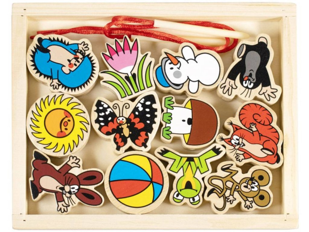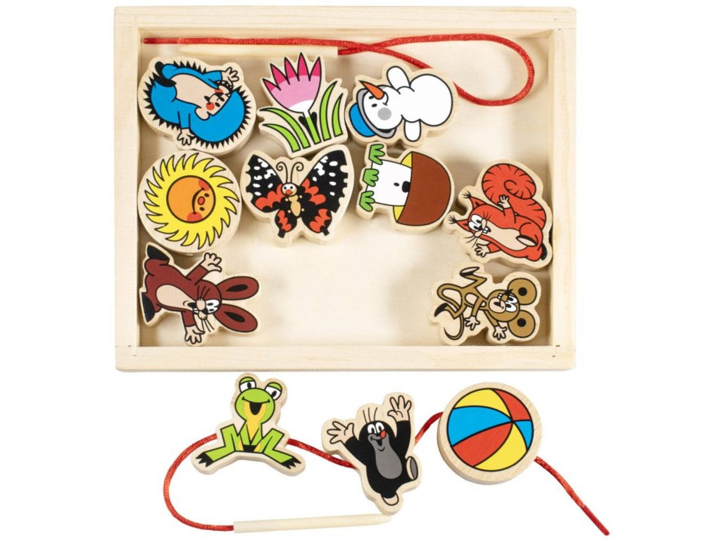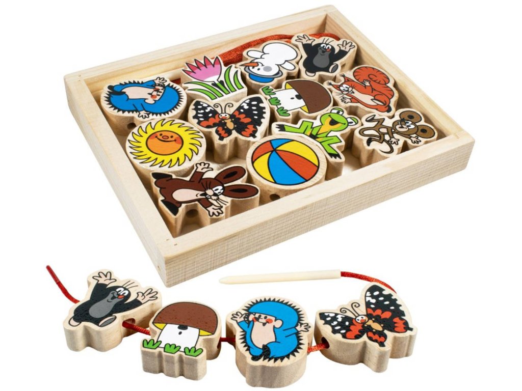 Dřevěná provlékačka Krteček pro nejmeněí děti. Součástí 12 navlékacích dílků a provázek s dřevěnou jehlou. Baleno v dřevěné krabici.