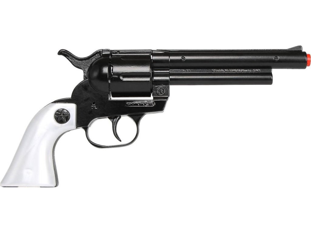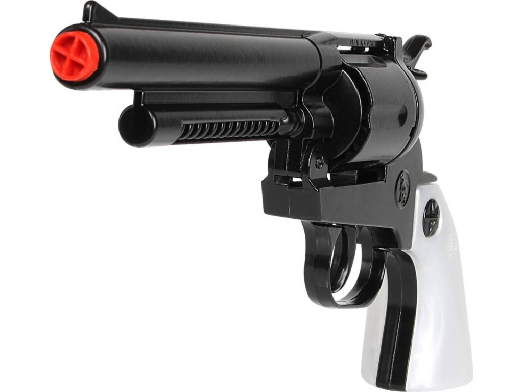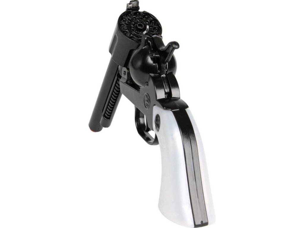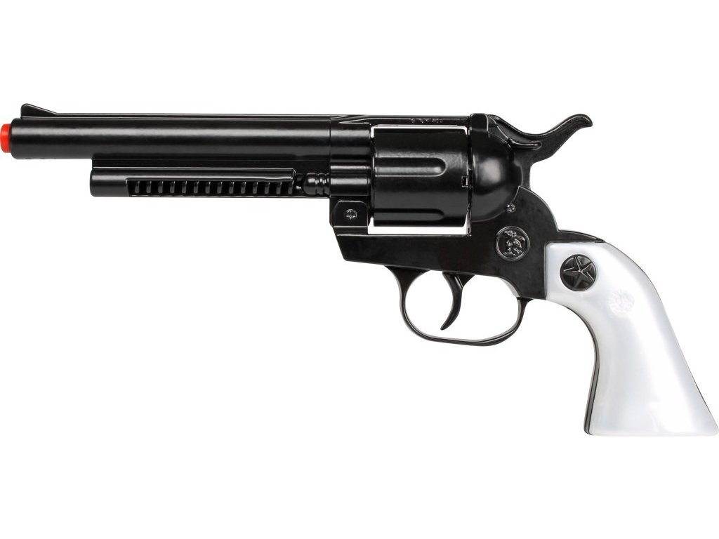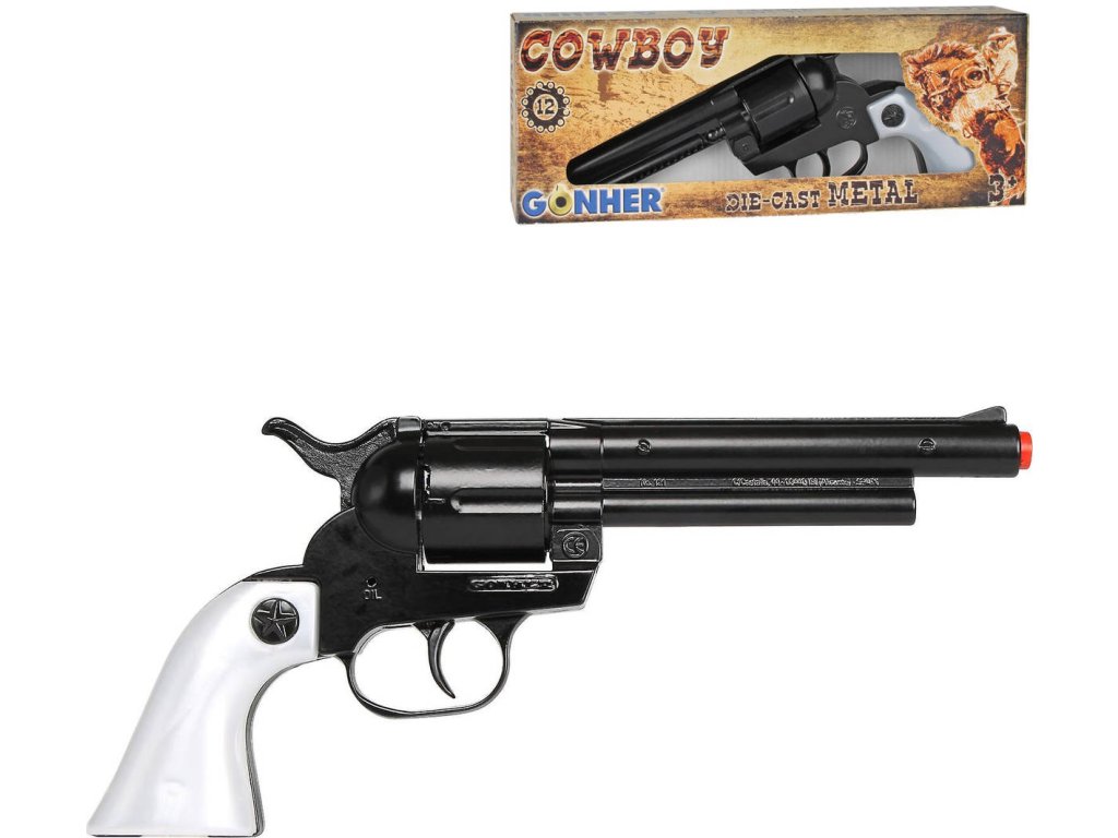 Věrná kopie opravdové zbraně – to je kovbojský revolver z kovu a plastu, v černé barvě, s bílou rukojetí, na kapsle, se zásobníkem na dvanáct ran. Pěkná hračka pro všechny malé kovboje a strážce zákona. Baleno v krabici.