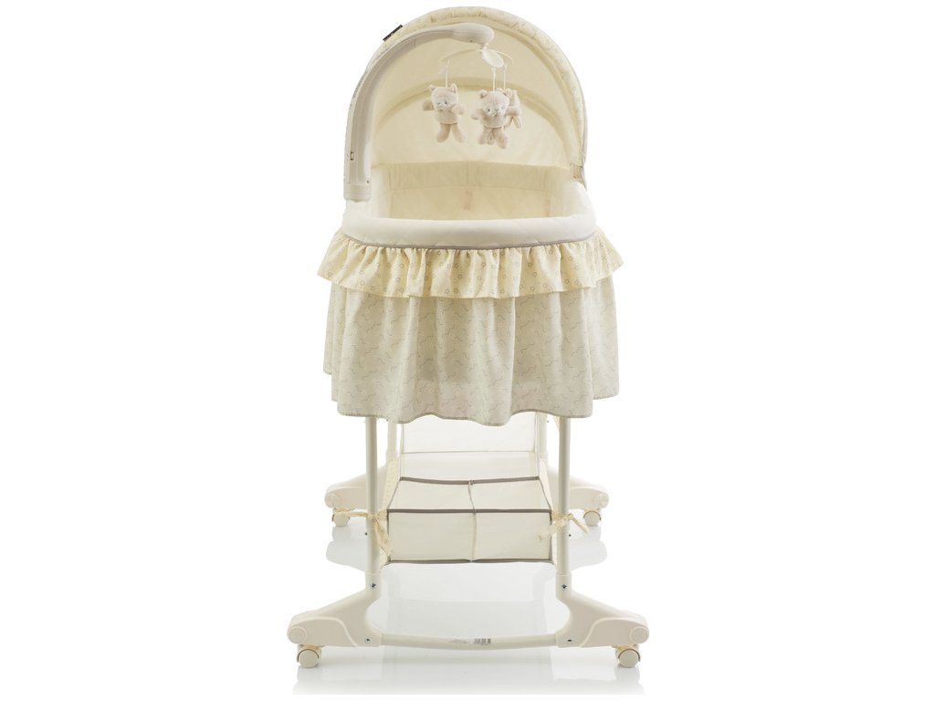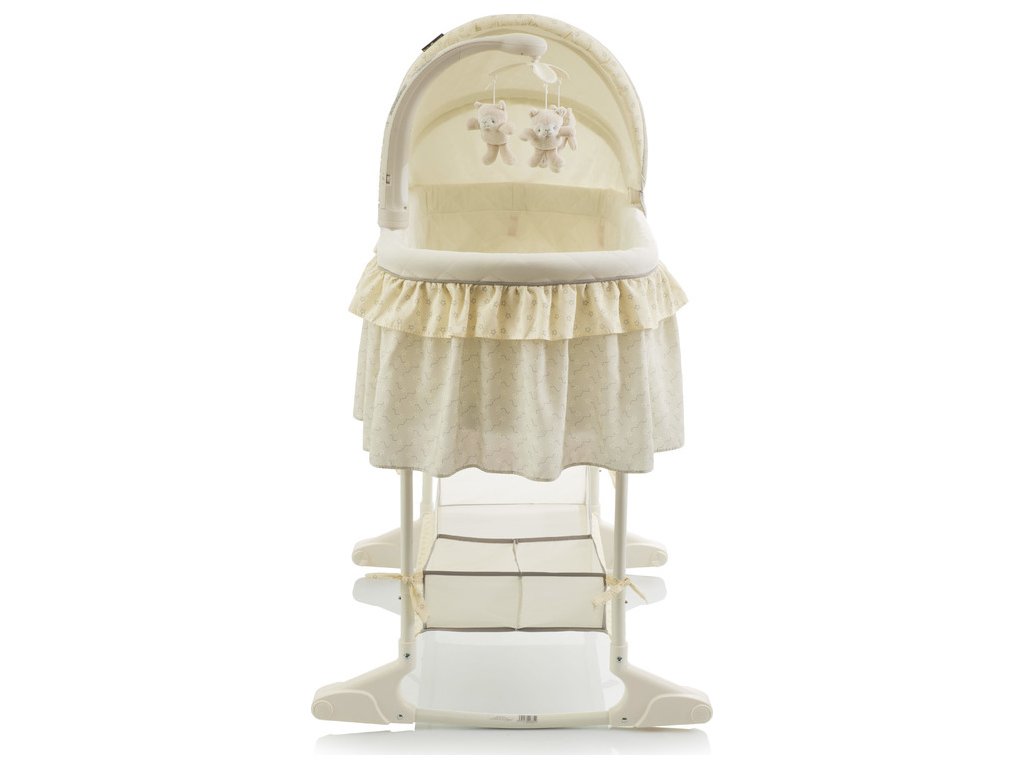 Je vhodná pro děti od narození. •multifunkční kolébka •3 pozice pro nastavení výšky lůžka •součástí kolébky je rameno na kterém je umístěno ovládání pro přehrání a hlasitost melodií, noční světýlko, vibrace a kolotoč s hračkami •matrace, sklápěcí stříška, velký koš pod kolébkou, kolečka s brzdou, celý potah lze sundat a vyprat •baterie nejsou součástí balení •pro děti od narození