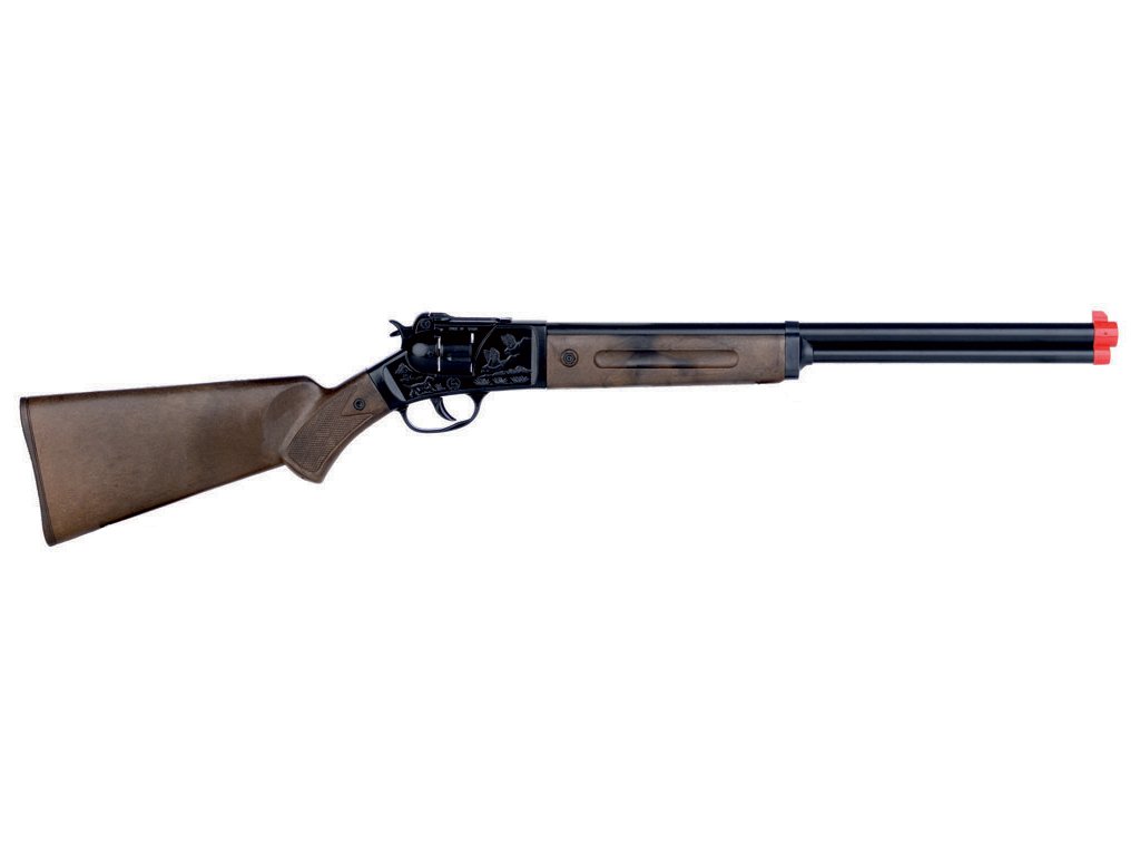 Věrná kopie opravdové zbraně – to je kovbojská puška z kovu a plastu, v černé barvě, na kapsle, se zásobníkem na dvanáct ran. Pěkná hračka pro všechny malé kovboje a strážce zákona.