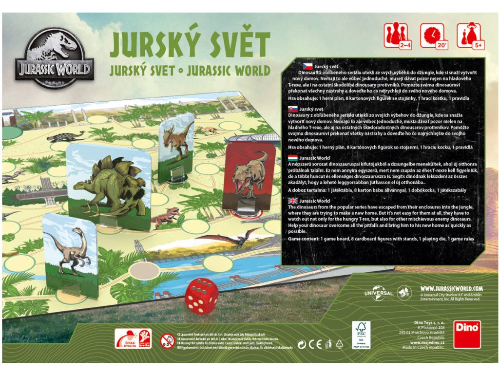 Dinosauři z oblíbeného seriálu Jurský svět utekli ze svých výběhů do džungle, kde se přes všechny nástrahy snaží vytvořit nový domov. Dávejte pozor nejen na hladového T-rexe, ale i na ostatní škodolibé dinousary protivníků. Vyhýbejte se překážkám a strategicky umisťujte nástrahy do cesty soupeřům tak, abyste se dostali do nového domova jako první. Dětská hra pro malé milovníky prehistorie od 5 let.