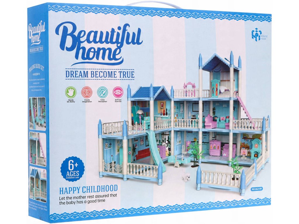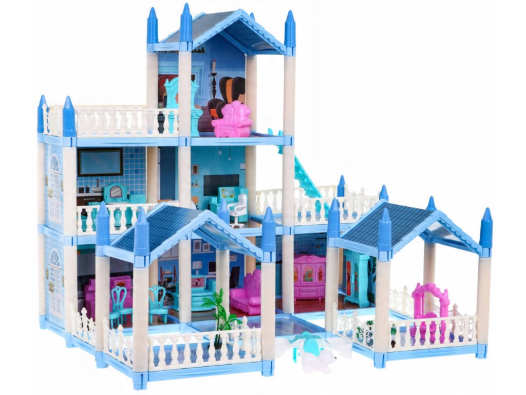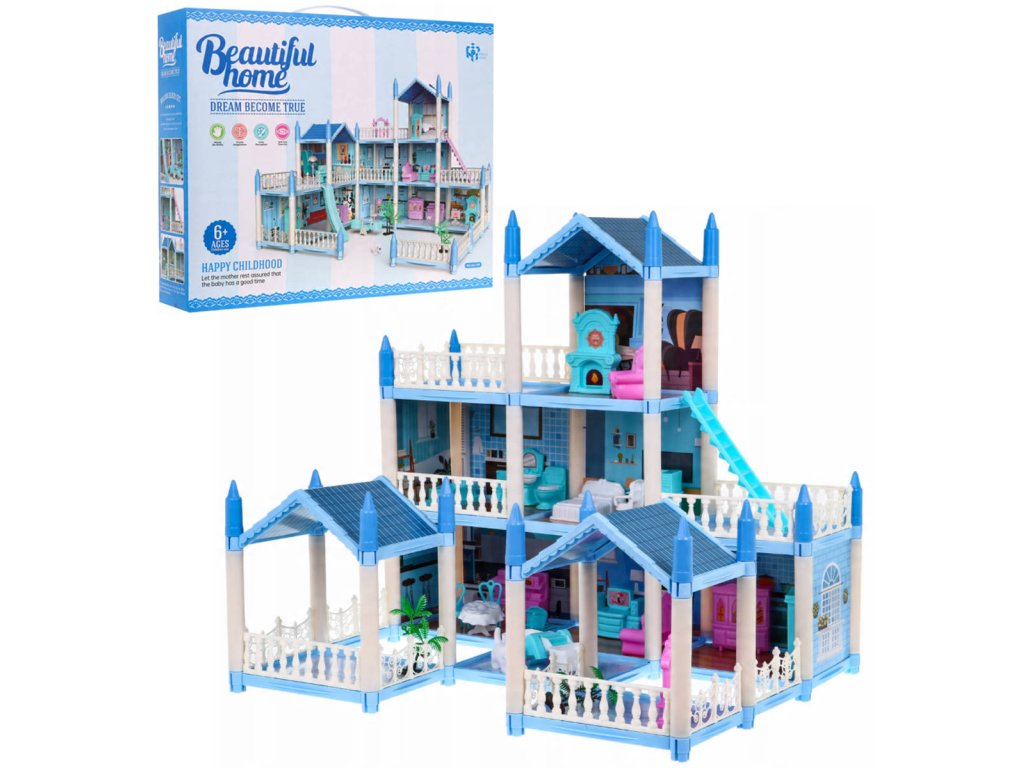Domeček pro panenky, třípatrový, s nábytkem. Modrá vila s vybavením. Nádherný tříúrovňový domeček k vlastnímu sestavení, určený pro děti od 6 let. Domeček se skládá ze šesti místností: ložnice s terasou, pracovny, obývacího pokoje s terasou, koupelny, kuchyně a jídelny. Venku se nachází také prostor s krbem a dětské hřiště s dvoumístnou houpačkou. Veškeré vybavení domečku je součástí sady.