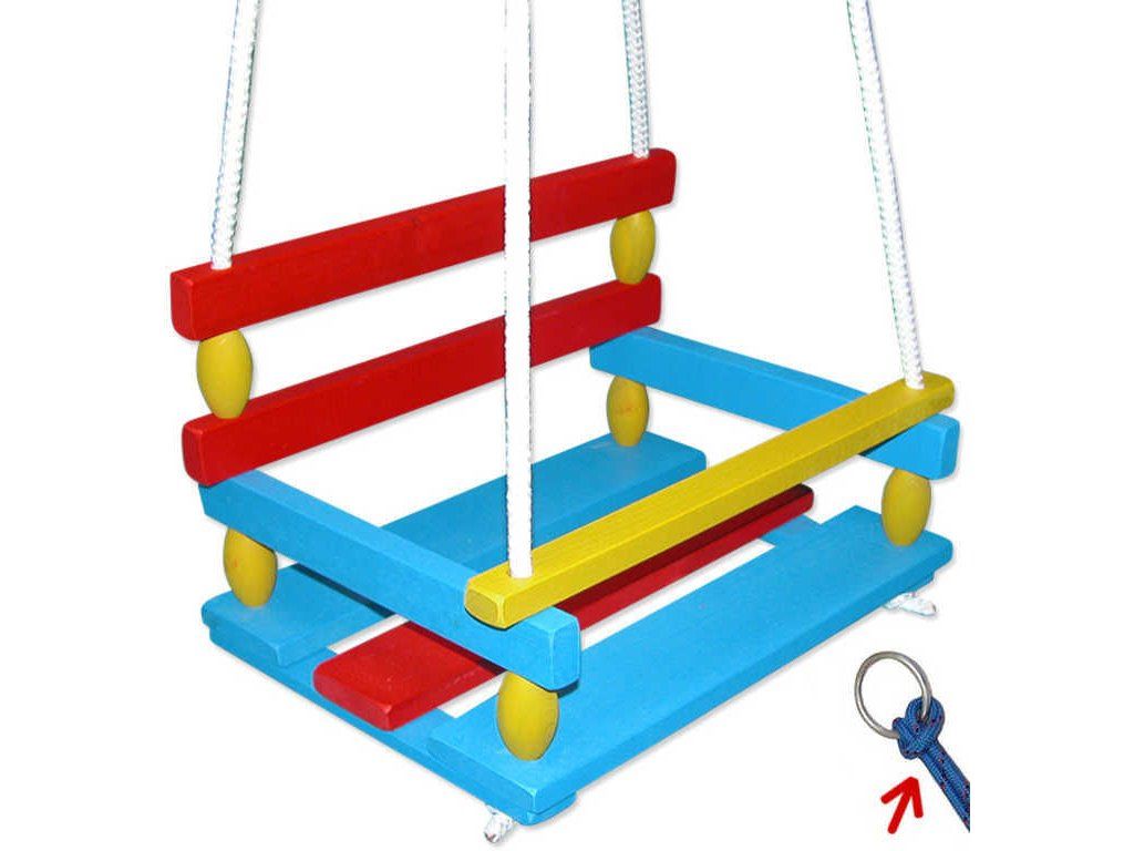 Houpačka je vyrobena z přírodního dřeva a opatřena přední ohrádkou. Tudíž je stabilní a bezpečná. Barevná kombinace červená, modrá a žlutá. Vhodná k venkovnímu i domácímu použití.
