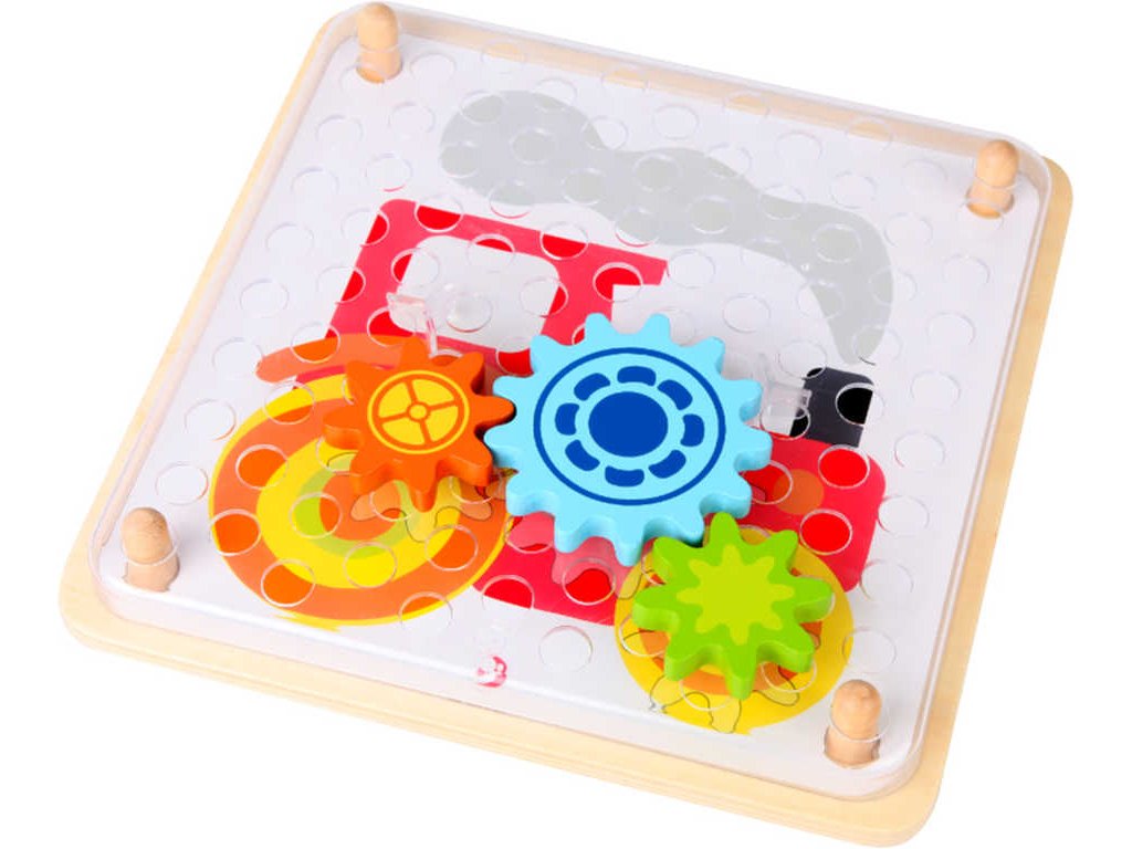 Dřevěná skládačka ozubená kolečka s předlohami. Jedná se o dřevěnou tabulku, do které se vkládají jednotlivé předlohy, které jsou součástí balení. Na předloze je nakresleno které ozubené kolečko má dítě