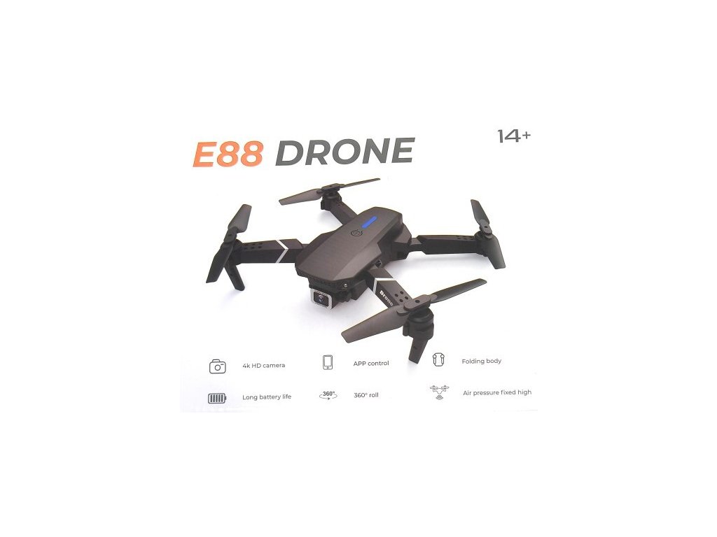 Dron E88 je moderní skládací dron vybavený 4K HD kamerou, která umožňuje pořizovat vysoce kvalitní letecké záběry. Tento model je určen pro uživatele od 14 let a je vhodný jak pro začátečníky, tak i pokročilé piloty, kteří chtějí zažít vzrušení z létání a zároveň zachytit unikátní pohledy na svět z výšky. Dron je černé barvy s decentními bílými prvky na ramenech, což mu dodává elegantní a moderní vzhled.