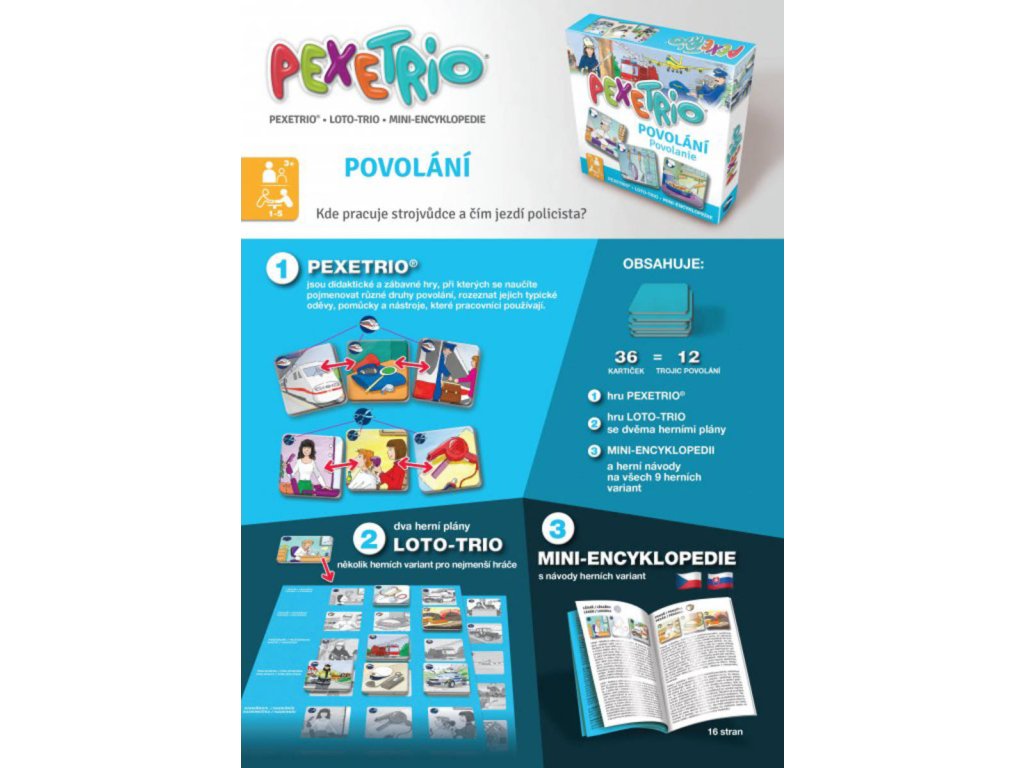 Pexetrio POVOLÁNÍ je zábavná hra inspirovaná pexesem, která děti zároveň i vzdělává. Děti se naučí poznávat nejběžnější povolání podle hesla „škola hrou“. Kromě toho, že si děti osvojí nejběžnější povolání zábavným způsobem, hra také napomáhá rozvíjet jejich logické myšlení a trénovat paměť hledáním trojice kartiček s pracovníky, jejich typickými oděvy, pomůckami a nástroji, které používají.