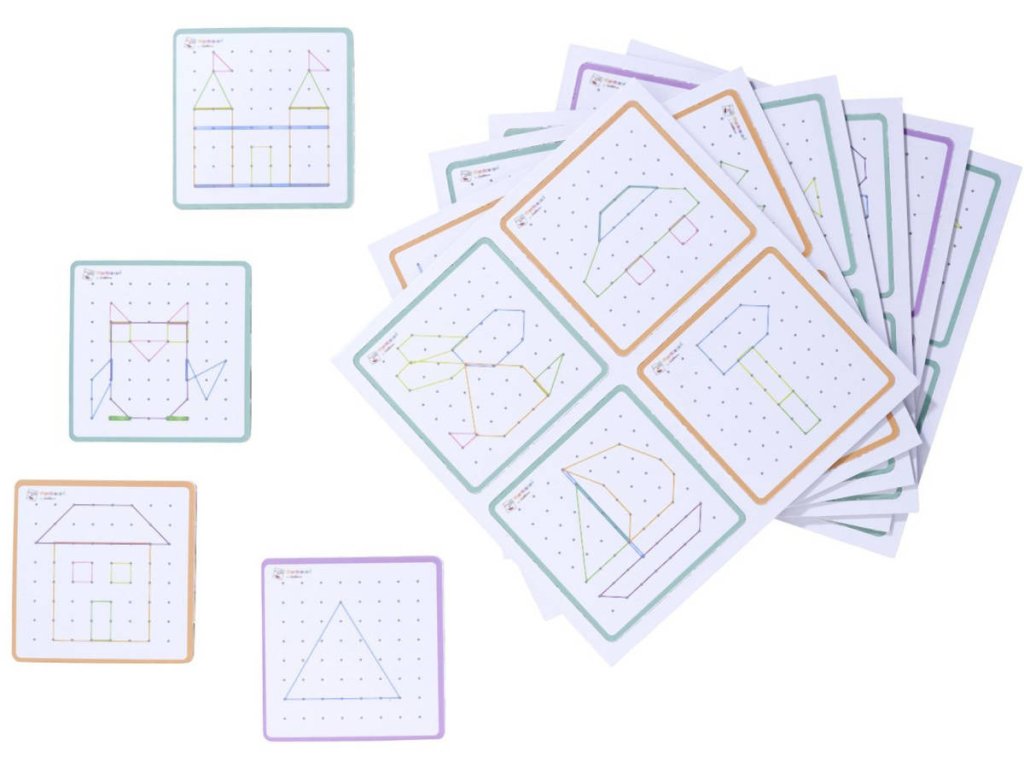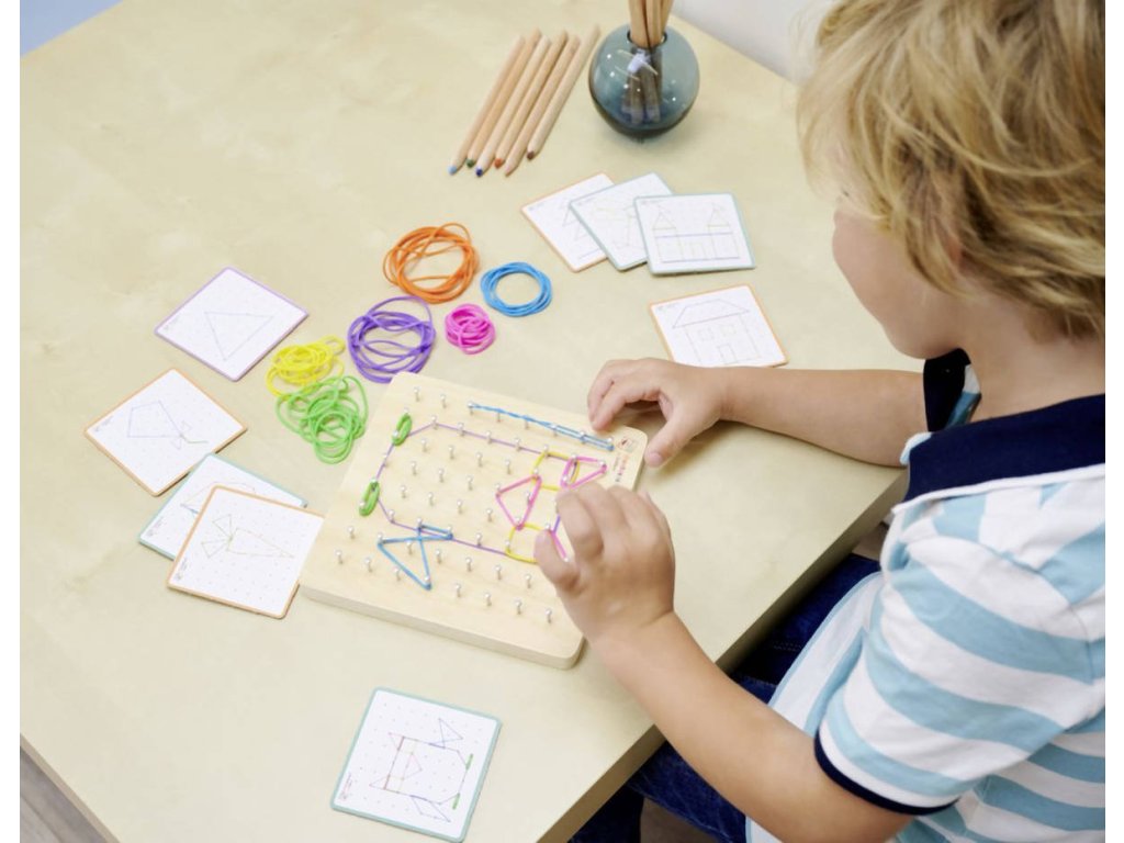 Montessori geometrická deska se 64 hřebíky a 60 barevnými gumičkami je skvělá sada pro podporu jemné motoriky a kreativity. Vaše dítě si může vymyslet postavičku podle svého přání nebo vytvořit motiv pomocí 24 karet s úkoly s různými úrovněmi obtížnosti. Geometrická deska je praktická a lze ji vzít kamkoli – do auta, do restaurace nebo k přátelům – ideální společník na cesty. Montessori geodeska o rozměrech 18×18 cm je vyrobena ze 100% lipové překližky s certifikátem FSC a je vhodná pro děti od 4 let.