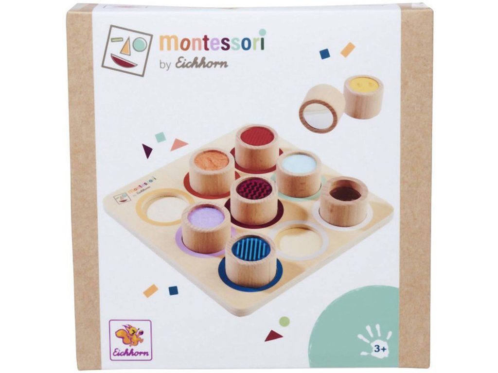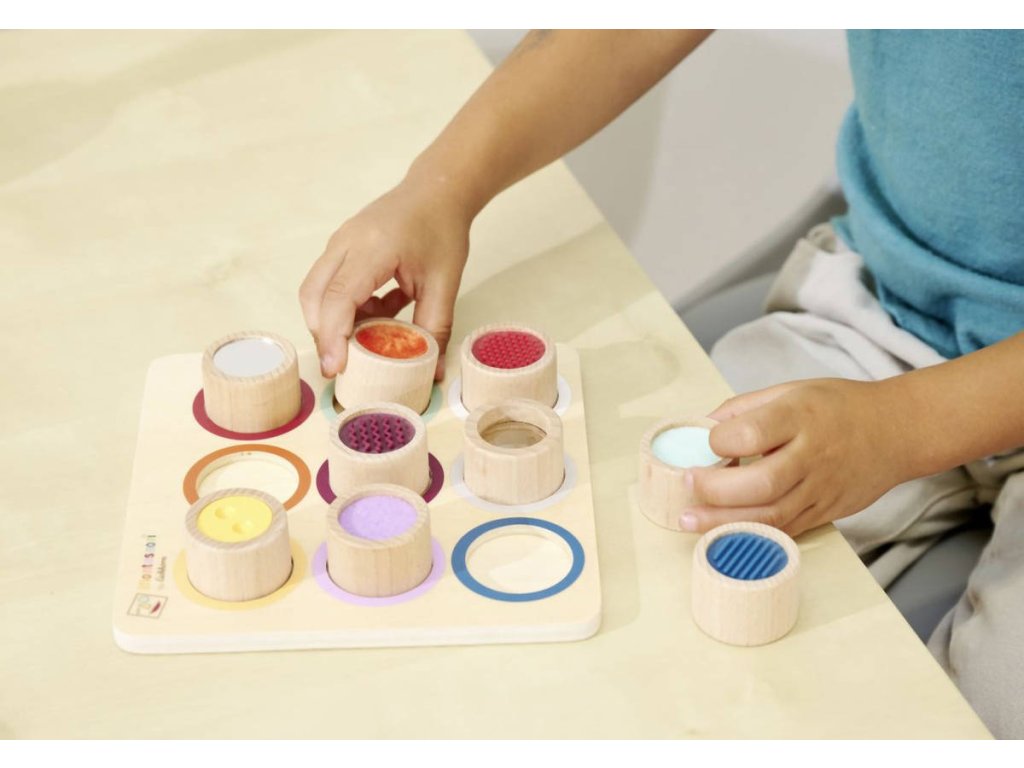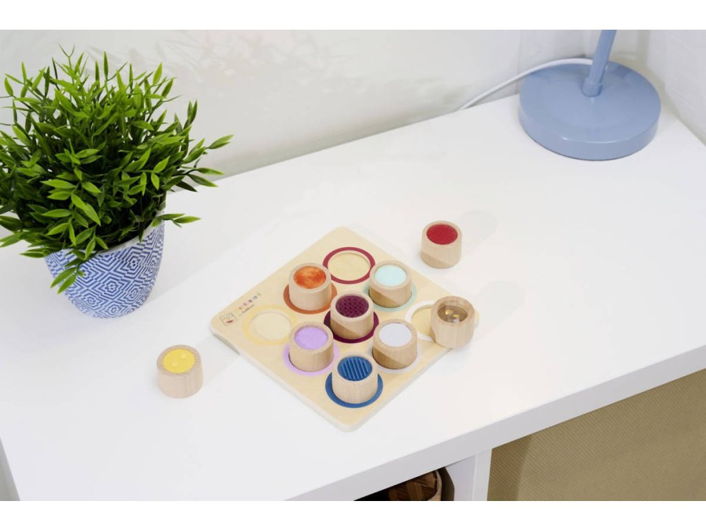 Vnímání je pro dítě důležitým smyslovým vývojem. Hra s různými povrchy a materiály podporuje hmat. Naše Montessori hmatová deska má 9 senzorických válců, ve kterých si dítě může osahat povrchy a textury. Montessori hmatová deska je vyrobena ze 100% bukového dřeva a překližky s certifikací FSC a je vhodná pro děti od 3 let.