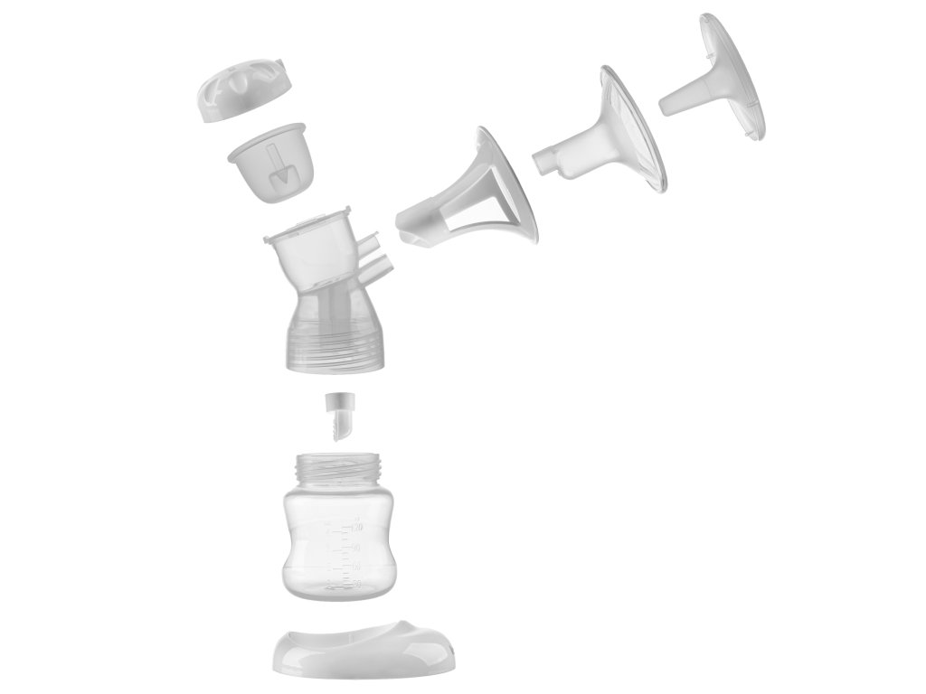 Součástí balení je návod, odsávačka, motorová jednotka, napájecí kabel, držák na lahvičku, lahvička, savička a redukce na lahvičku s úzkým hrdlem. Odsávačka je kompatibilní s lahvičkami AVENT.