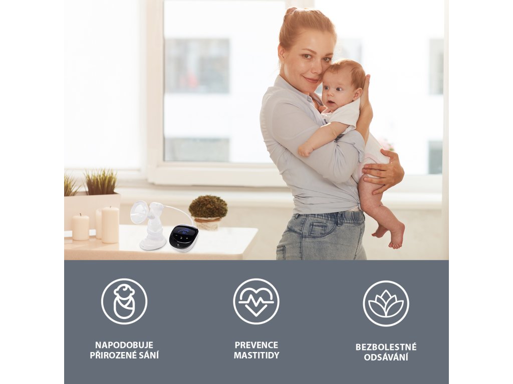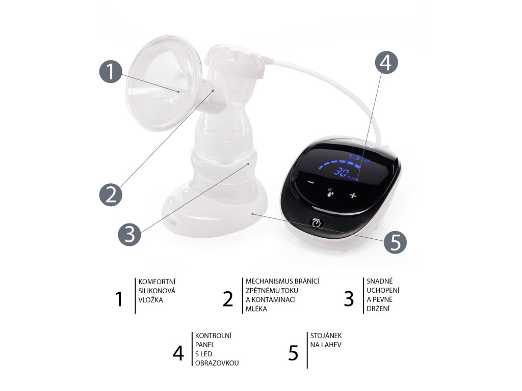 LED display signalizuje aktuální nastavení v reálném čase. Motorovou jednotku lze napájet pomocí kabelu s přípojkou micro USB nebo bateriemi. Membránová konstrukce odsávačky zabraňuje míchání vzduchu a kapaliny, brání zpětnému toku mléka a jeho kontaminaci.