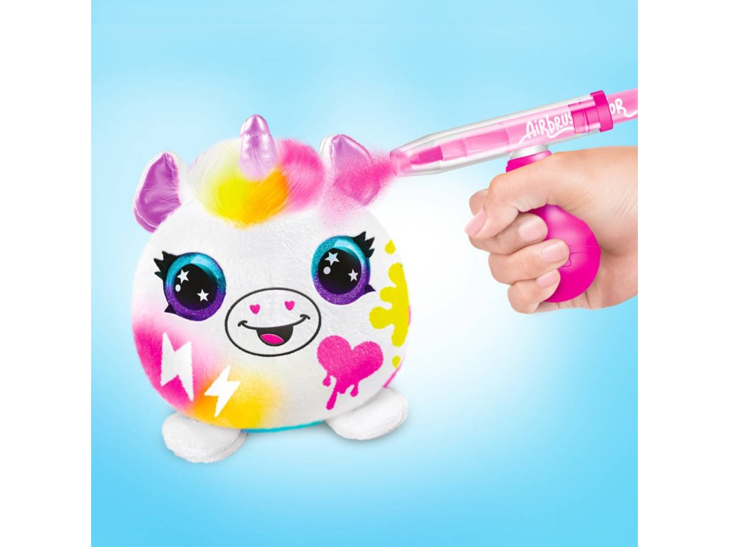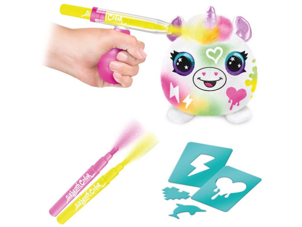 Obsah balení: plyšové zvířátko, airbrush rozprašovač, 2 fixy, 25 šablon