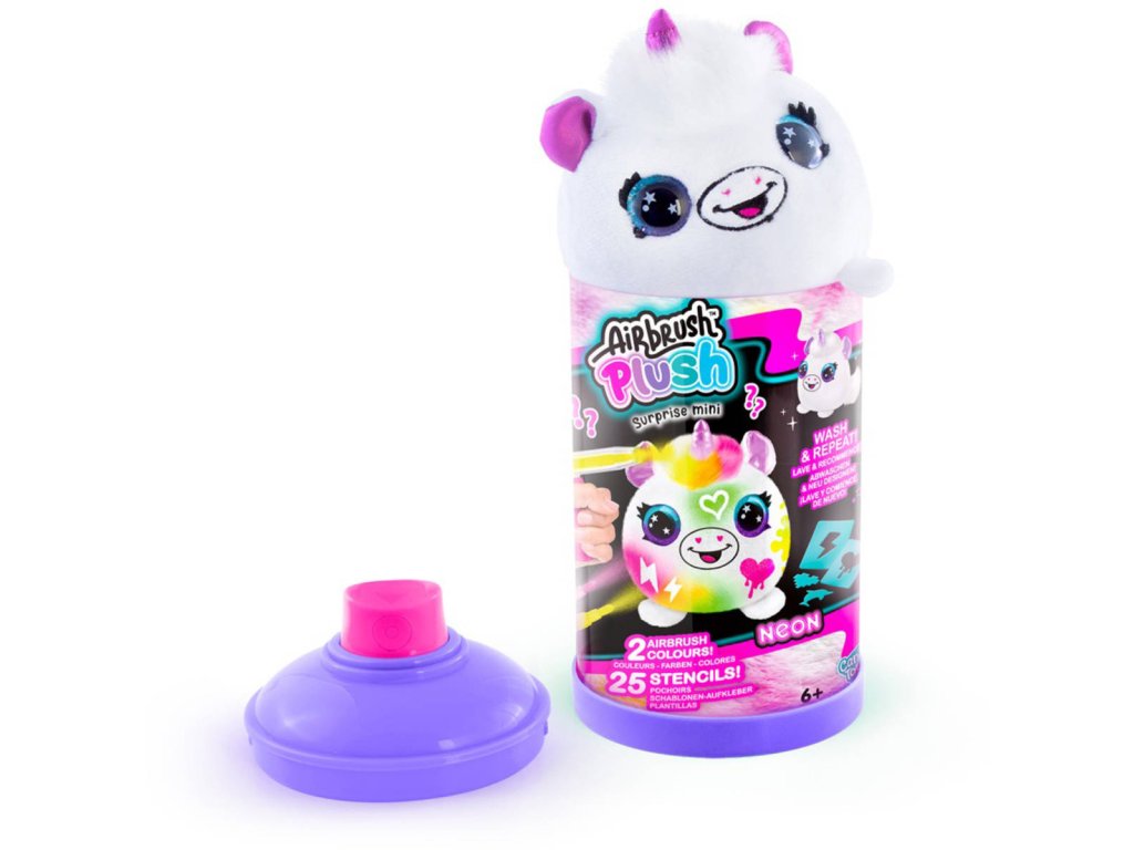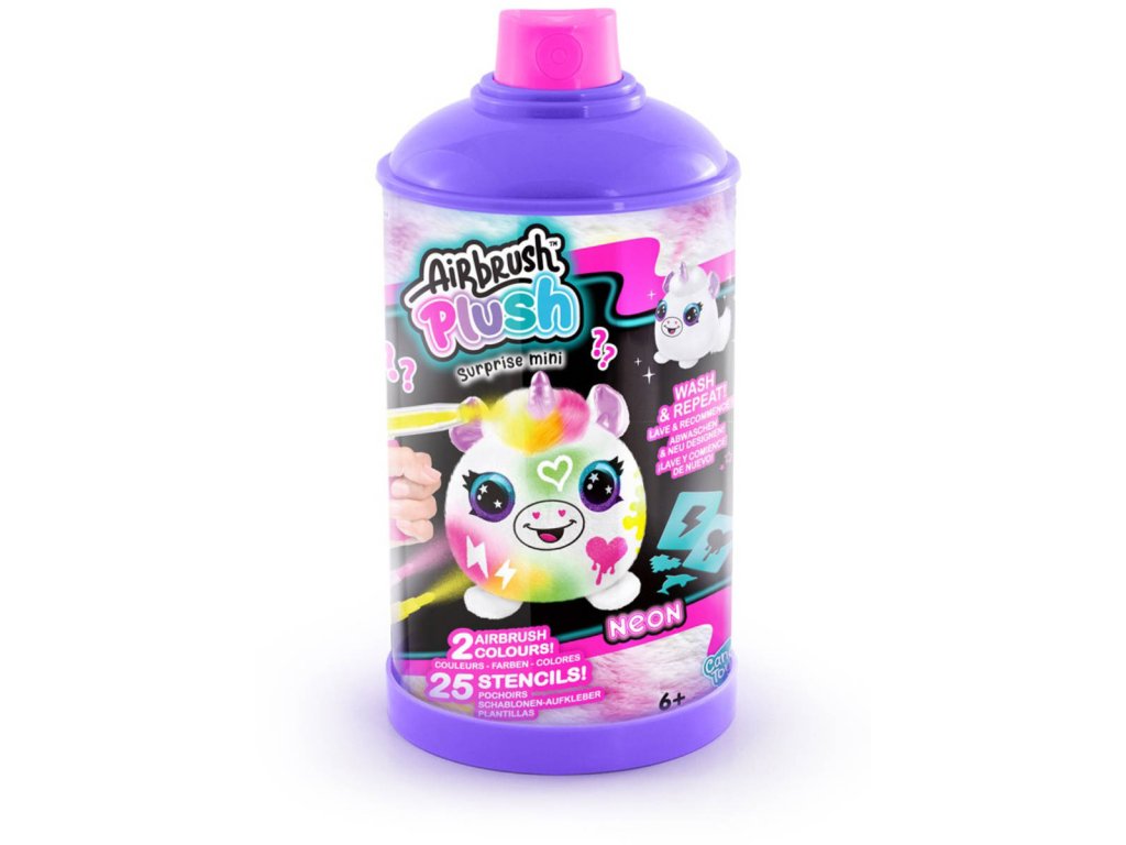 Airbrush kreativní sada Neon Mini překvapení ve tvaru spreje skvěle zabaví každého. Uvnitř balení najdete jednoho plyšáka o velikosti 10 cm, airbrush nástroj, 2 fixy a 25 šablon, se kterými můžete plyšáka vyzdobit podle své fantazie. Když vás design omrzí, stačí plyšáka vyprat dle návodu a po uschnutí můžete znovu tvořit. Plyšák v balení je překvapení, série obsahuje 6 druhů plyšáků.