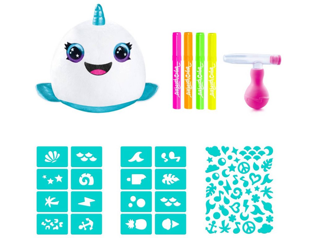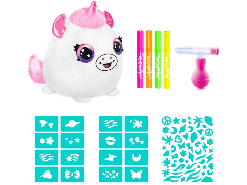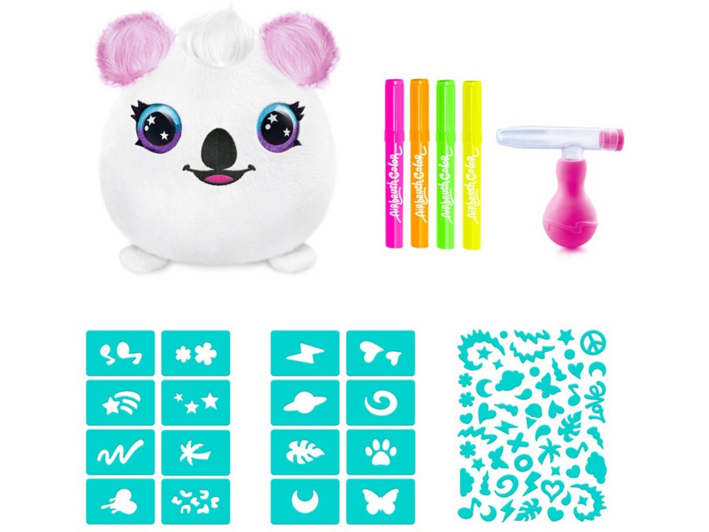 Obsah balení: plyšové zvířátko, airbrush rozprašovač, 4 fixy, 70 šablon