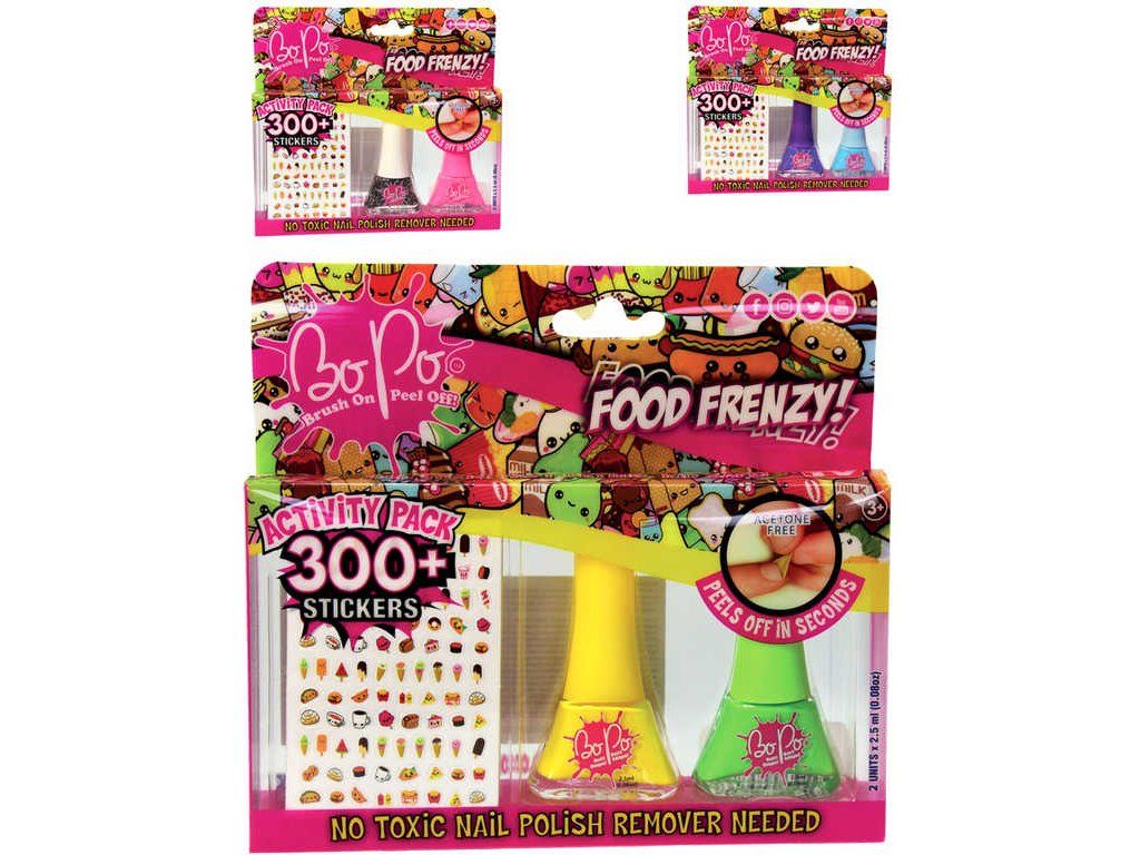 BoPo sada dvou slupovacích laků odlišných barev a 300ks samolepek na třech arších, s motivem Jídlo, pro všechny malé parádnice. Sada v několika variantách provedení.