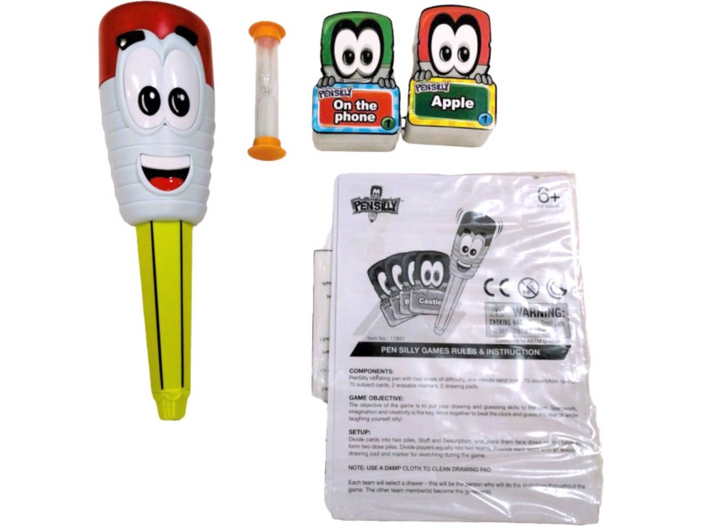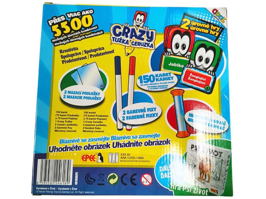Obsah balení: 150 karet (75 karet Předmětů a 75 karet Popisů), Crazy tužka, 2 mazací podložky, 2 barevné fixy, minutový časovač