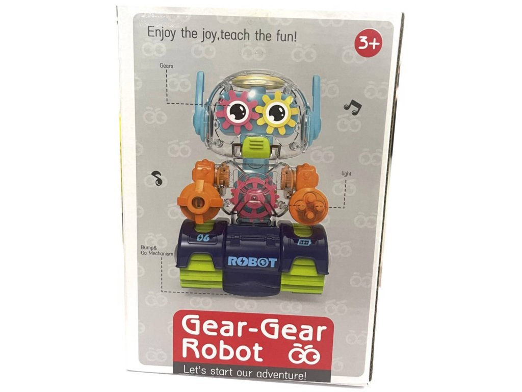 Robot se světelným a zvukovým efektem je interaktivní hračka určená pro děti od tří let, která podporuje kreativitu a rozvíjí fantazii. Robot vyniká svým zábavným designem, kdy průhledná plastová hlava odhaluje barevná ozubená kolečka, která se při zapnutí otáčejí a vytvářejí tak zajímavý vizuální efekt. Dvě barevné varianty robota – oranžovo-modrá a zeleno-modro-fialová – nabízí dětem možnost výběru podle jejich oblíbených barev.