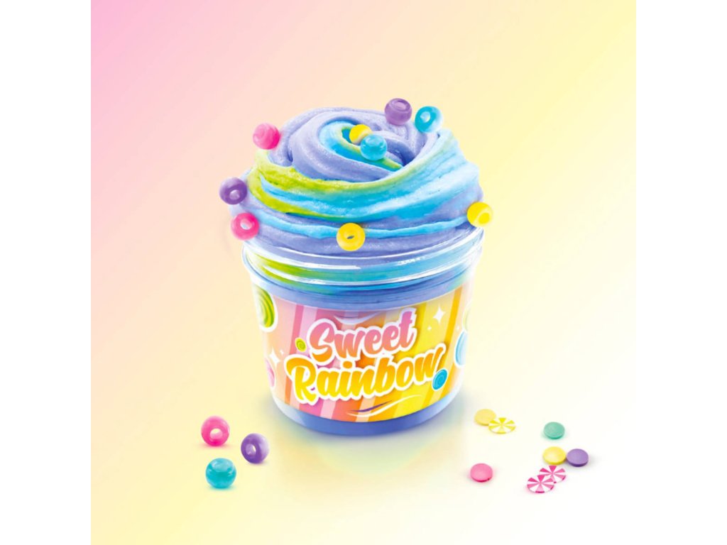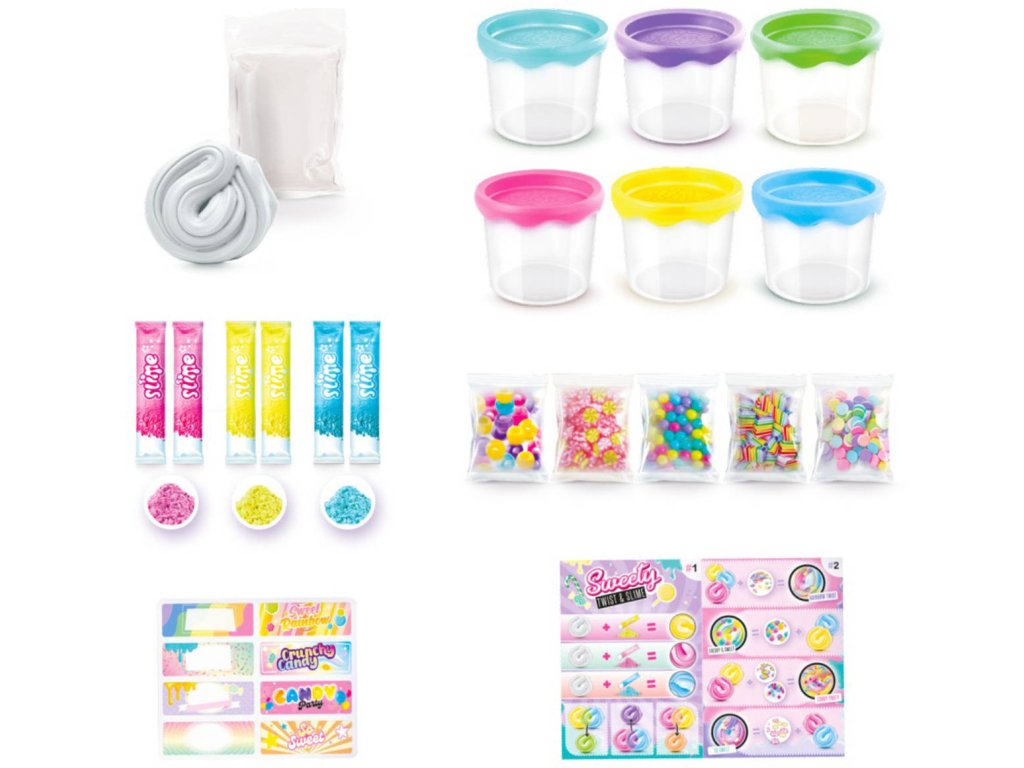 Obsah balení: sáček průhledného slizu, 6 sáčků práškové barvy do slizu, 5 druhů ozdob do slizu, 6x kelímek, karta s recepty na sliz, arch samolepek na kelímky