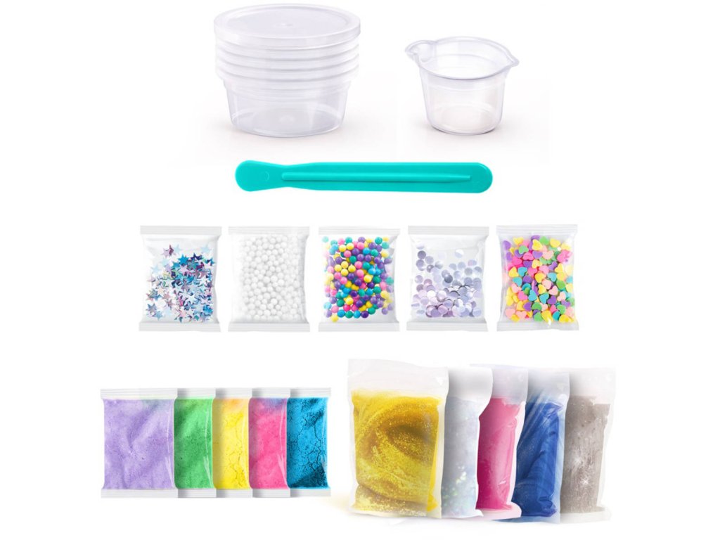 Obsah balení: 5 sáčků barevných slizů, 5 sáčků diy slizů, 5 druhů ozdob do slizu, 5x kelímek, špachtle na míchání