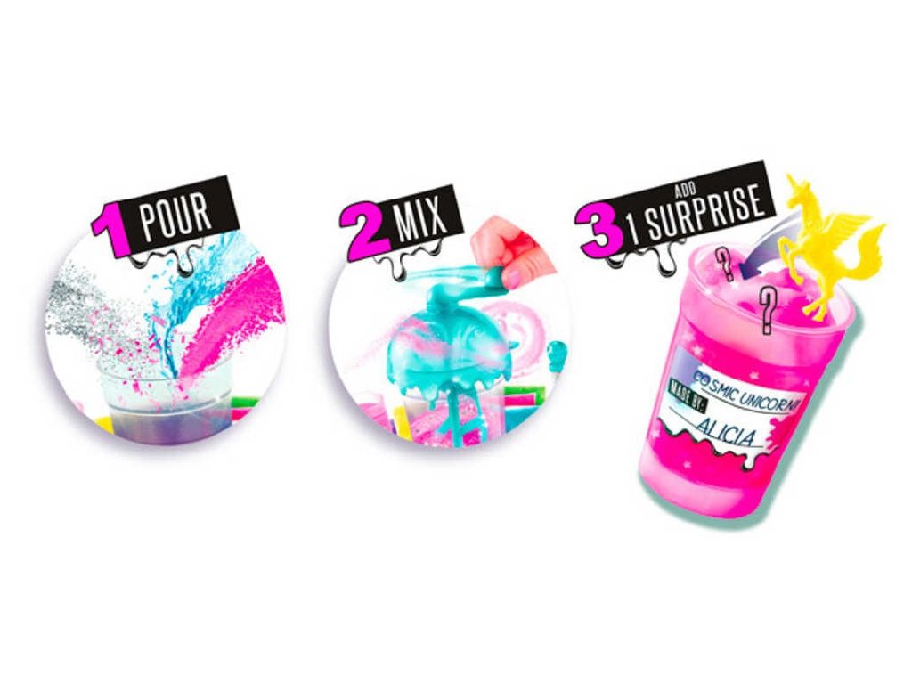 Nasypejte do kelímku prášek, přidejte glitry a figurku. Nalijte vodu až po rysku, zavřete kelímek a směs pořádně protřepejte. Pak kelímek otevřete a počkejte pět minut. Sliz je hotový. Kombinujte barvy, přidejte třpytky a užijte si tu pravou zábavu se slizem.