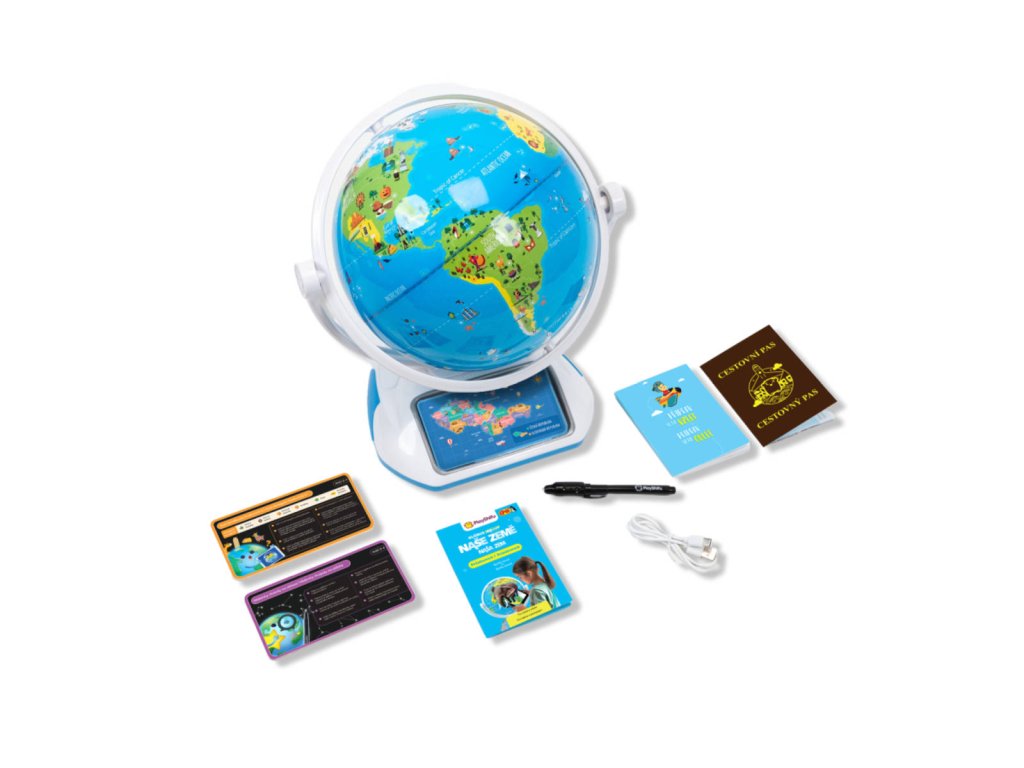 V balení naleznete Glóbus, krátký návod, cestovní pas, knížku s nálepkami, vyměnitelné panely, USB nabíjecí kabel a razítko.
