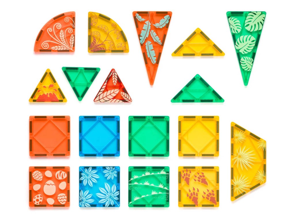 Obsah sady - 23 dílků: 8 čtvercových dílků, 7 trojúhelníkových dílků, 2 půlkruhové dílky, 1 čtyřúhelníkový dílek, 5 dinosaurů.