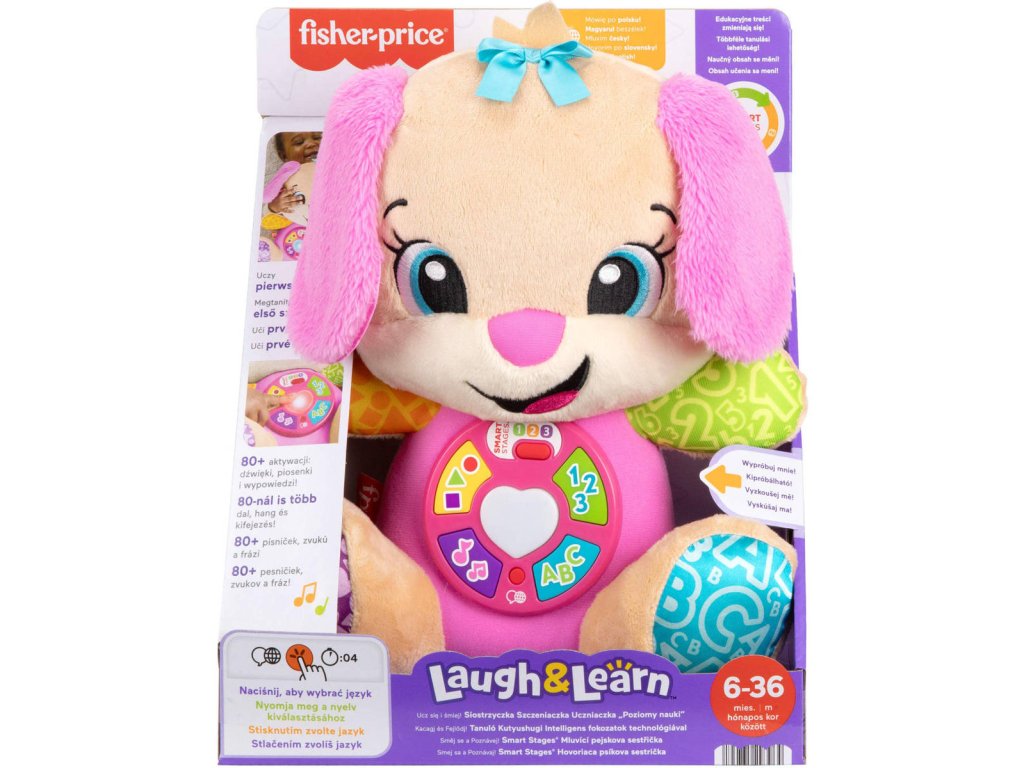 Mluvící pejskova sestřička Smart Stages z řady Fisher-Price Směj se a Poznávej! je příjemná plyšová hudební hračka, která seznamuje dítě s abecedou, tvary, prvními slovy a dalšími prvky! Děti mohou stisknout 5 tlačítek na bříšku a sledovat, jak se její srdíčko rozsvěcuje barvami, zatímco hraje více než 80 písniček, zvuků a frází. Díky více než 12 originálním písničkám a 3 úrovním učení Smart Stages, které rostou spolu s dítětem od kojence až po batole, se Mluvící pejskova sestřička stane nejlepší kamarádkou vašeho děťátka. Vyžaduje 3 baterie AA, které jsou součástí balení. Pomocí tlačítka zeměkoule můžete vybrat jazyk: polština, maďarština, čeština, slovenština nebo angličtina. Barvy a vzhled výrobku se mohou lišit.