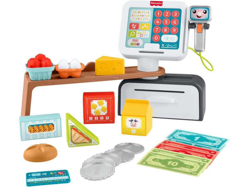 Obsah balení: registrační kasa s nastavitelným pultem a skenerem, dětské peníze, makety potravin