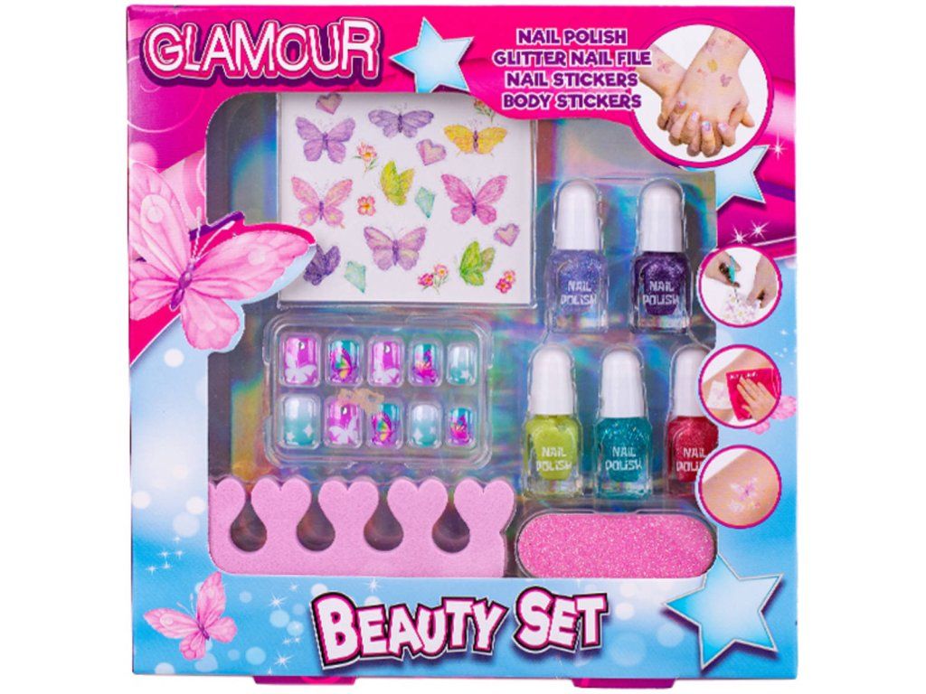 Glamour dětská sada krásy s laky na nehty, pilníkem a nálepkami na tělo a nehty. Dětská kosmetika.