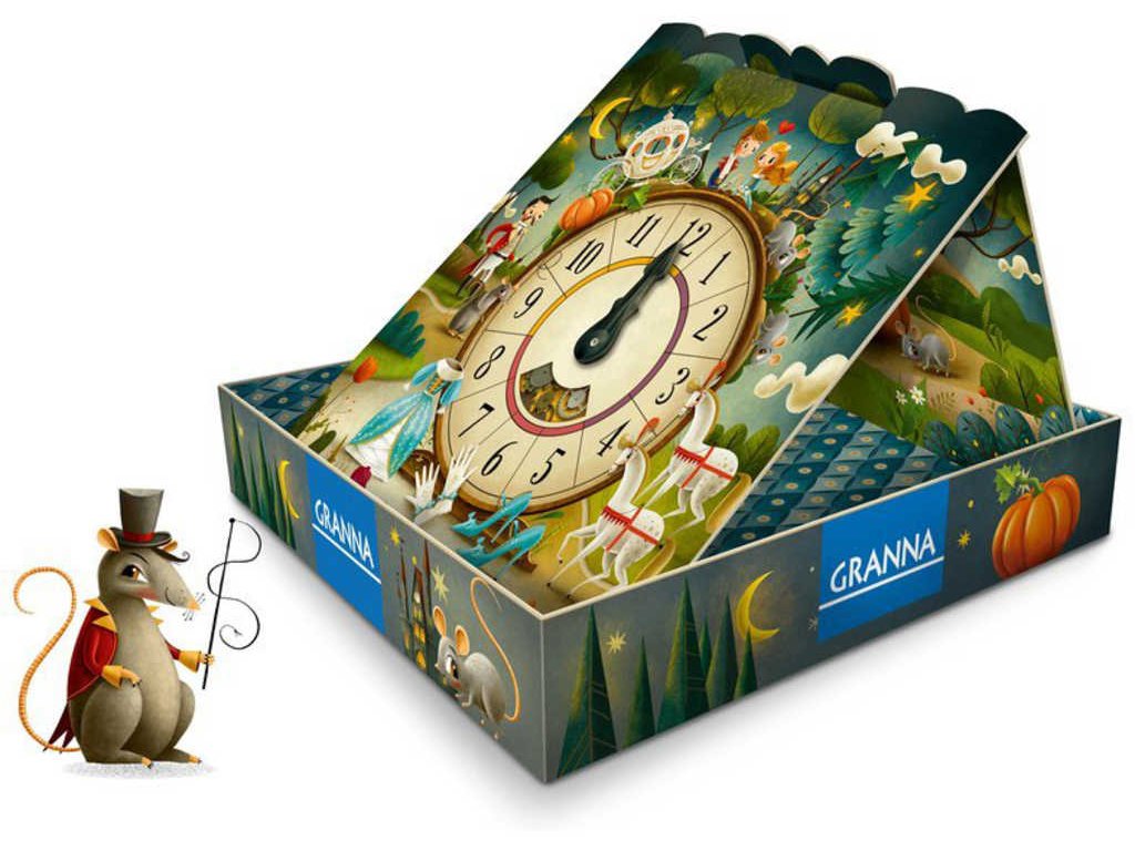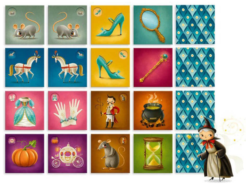 Obsah balení: hrací plocha s hodinami, 12 základních kartiček (6 dvojic: 2 myšky, 2 koně, 2 střevíčky, šaty a rukavice, potkan a kočí, dýně, kočár), 12 speciálních kartiček (3 zrcátka, 3 kotlíky, 3